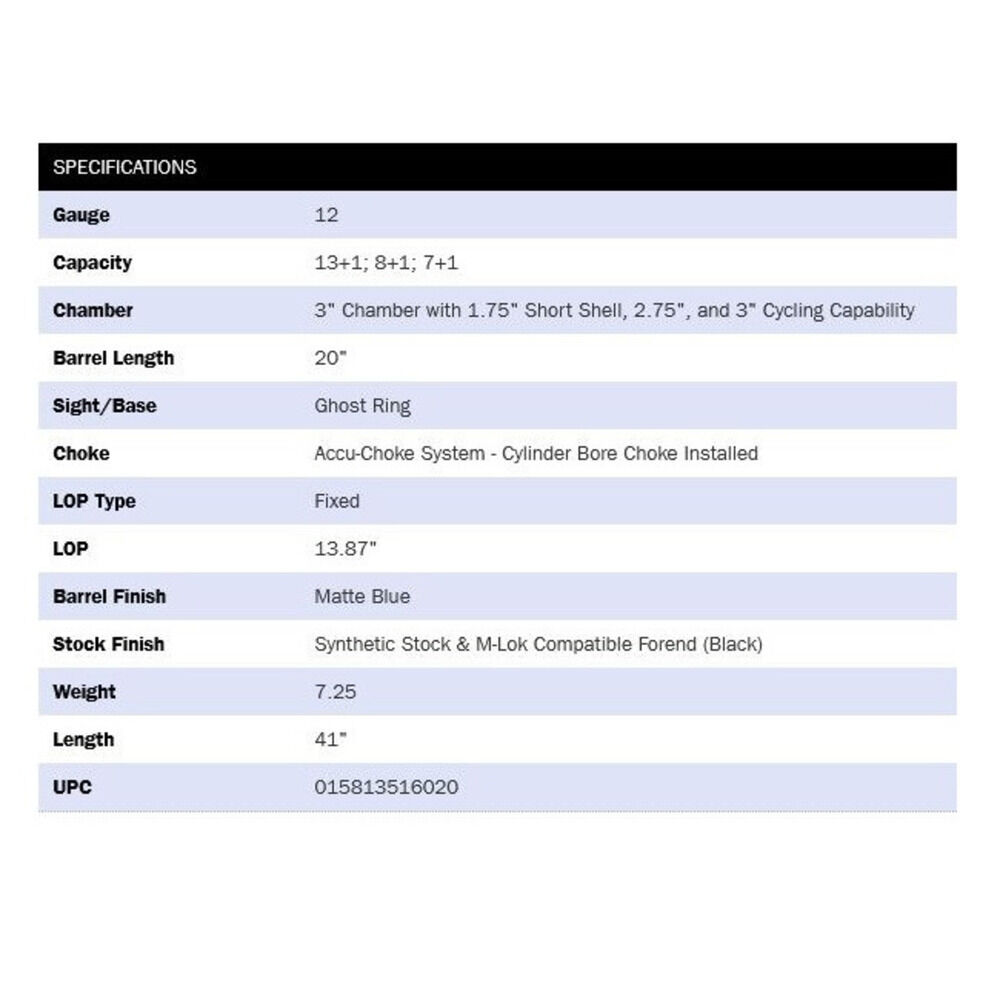 Kaliber 12/76, Modell 590S M-Lok Black VRep.Flinte 7+1(8+1) und/oder (13+1) Patronen, Lauflänge 20"/50,8cm, schwarz matt, Systemkasten vorgebohrt für Montageschiene, Visier Ghostring mit rotem Visierkorn, Synthetikschäftung und M-Lok Vorderschaft schwarz, Recoil Schaftkappe, Accu-Choke System mit Choke Cylinder Bore, Gesamtlänge 41"/104cm, Gesamtgewicht 7,25lbs/3.292gramm ohne Munition, CIP Stahlschrotbeschuss, Code 51602 Mossberg USA. Neu 2022