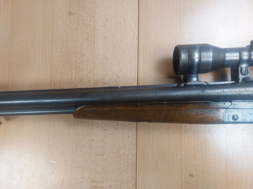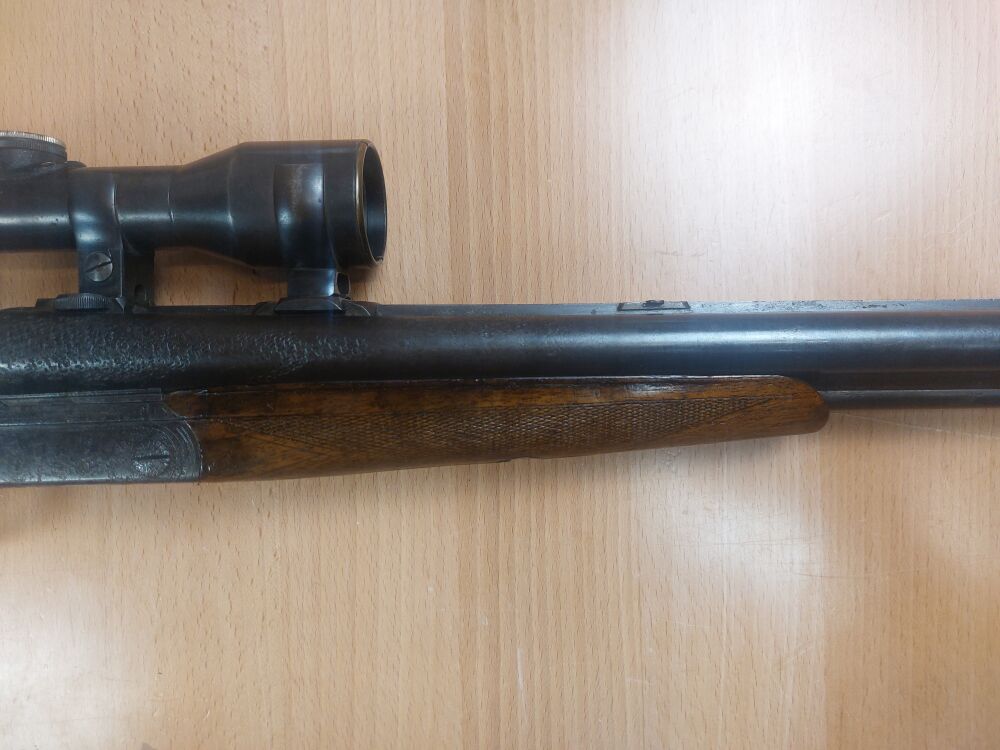 Drilling Franz Jäger, Suhl Modell Herold Kaliber 16/65; 8x57IR Lauflänge mm 1/2, 1/1 Choke Schaftlänge mm Gesamtlänge mm Suhler Einhakmontage Zielfernrohr "Ebra" 4x36 Bel... ...weiterlesen