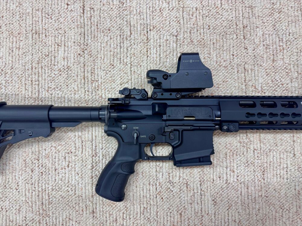 Es handelt sich um eine halbautomatische Büchse von Haenel im Kaliber .223 Rem.