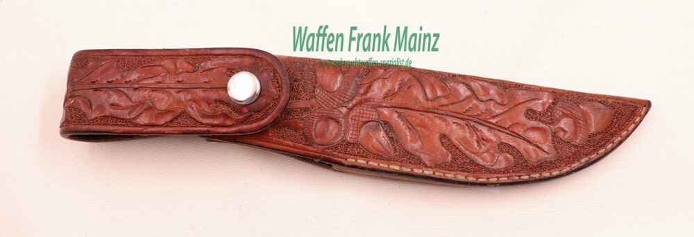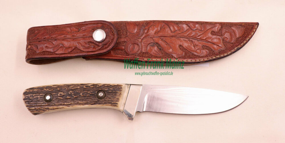 perfekte Klinge, nicht überarbeitet, Scheide mit leichten Gebrauchsspuren, das Modell „rotwild“ ist ein schweres, robustes und dennoch formschönes Jagdmesser, das sich für keine Aufgabe zu schade ist – von PUMA Solingen, Jagdlich genutzte Messer sollten eine gute Stabilität besitzen, Diese Erkenntnis wurde bei PUMA „rotwild“ konsequent umgesetzt, entstanden ist ein schwerer Jagd-Allrounder mit starker Flachschliffklinge, deren voll durch den Griff durchgehender Erl mit voluminösen Schalen aus Hirschhorn bestückt ist, als Handschutz dient ein Parierstück aus massivem Neusilber, durch diese Eigenschaften ist das Modell „rotwild“ auch für schwerere Schneidaufgaben geeignet und lasst seinen Besitzer in keiner Situation im Stich, inkl. hochwertige Leder-Gürtelscheide mit punsierter Oberfläche mit Eichenlaubmuster, hochwertige Hirschhornbeschalung, Integralklinge aus 55-57 HRC Klingenstahl härtegeprüft auf 1.4116