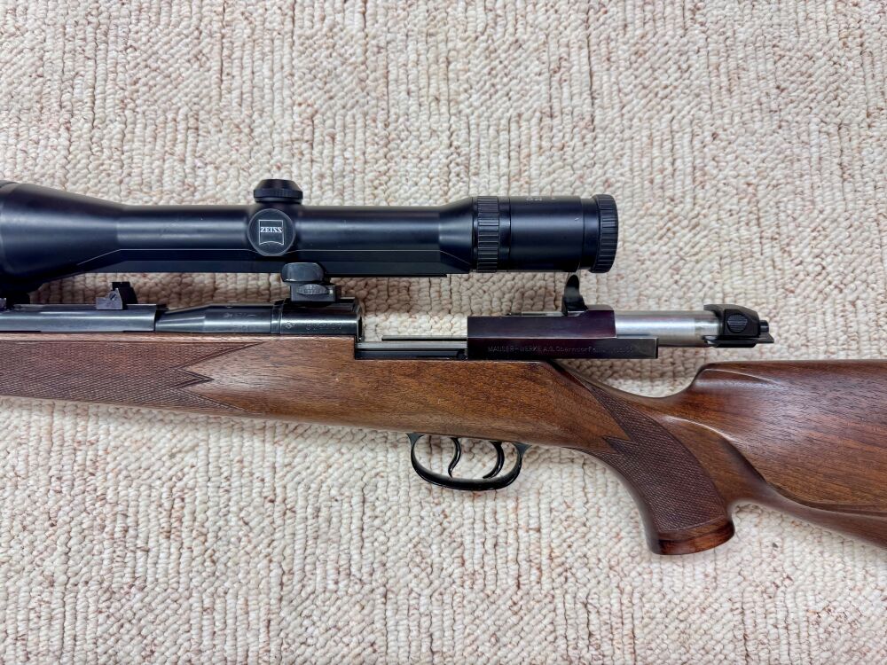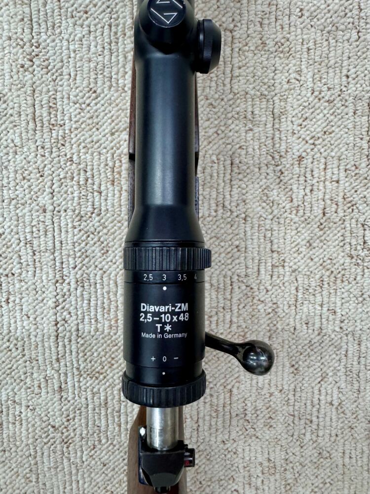 Es handelt sich um eine Repetierbüchse von Mauser im Kaliber 7 × 64. Ausstattung: Lauflänge: 61 cm Schaftlänge: 37,5 cm Optik: Zeiss Diavari-ZM (2,5–10 × 48); Absehen 4 Suhler Einhakmont... ...weiterlesen
