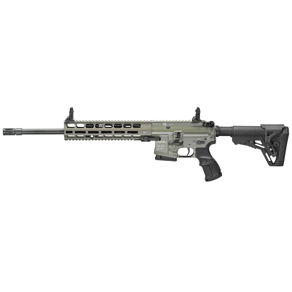 Mit der ?Competition Rifle? 223, kurz CR 223 knüpft die Waffenschmiede Haenel an Ihre lange Tradition in der Fertigung von halbautomatischen Büchsen an. Einst wurde bei C.G. Haenel in Suhl das erste Sturmgewehr der Geschichte gebaut und entwickelt. Es handelt sich bei der CR 223 um eine halbautomatische Büchse mit Pistonsystem im Kaliber .223 Rem. auf Basis des legendären AR 15 Systems. Als moderner Selbstlader in Zentralfeuer-Ausführung, funktioniert auch die Haenel CR 223 als Gasdrucklader mit Drehkopfverschluss. Der Teleskop-Hinterschaft ist in sechs Stufen längenverstellbar. Die Büchse verfügt über einen freischwingenden, kaltgehämmerten Lauf der in drei verschiedenen Lauflängen: 423 mm / 368 mm / 254 mm erhältlich ist. Je nach Lauflänge beträgt die Gesamtlänge zwischen 938 mm und 684 mm. Das Gewicht beträgt je nach Ausführung und Zubehör ca. zwischen 3,35 kg und 3,6 kg. Neben dem Direktabzug mit ca. 3.200 g ist auch ein optionaler Feinabzug erhältlich, dieser löst bei ca. 1.500 g aus. Die Sicherung ist beidseitig bedienbar.