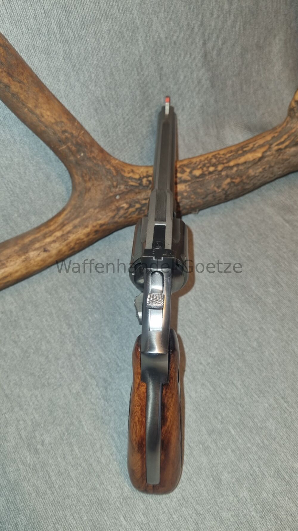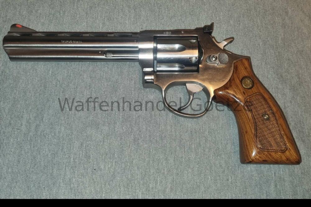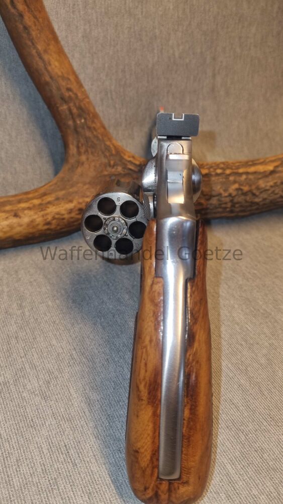 Lauflange 6 ", sechsschüssiger Stainless Steel-Revolver, höhen- und seitenverstellbares Visier, ventilierte Laufschiene, originale Holzgriffschalen mit Firmenlogo und Fischhaut, gebraucht, jedoch... ...weiterlesen