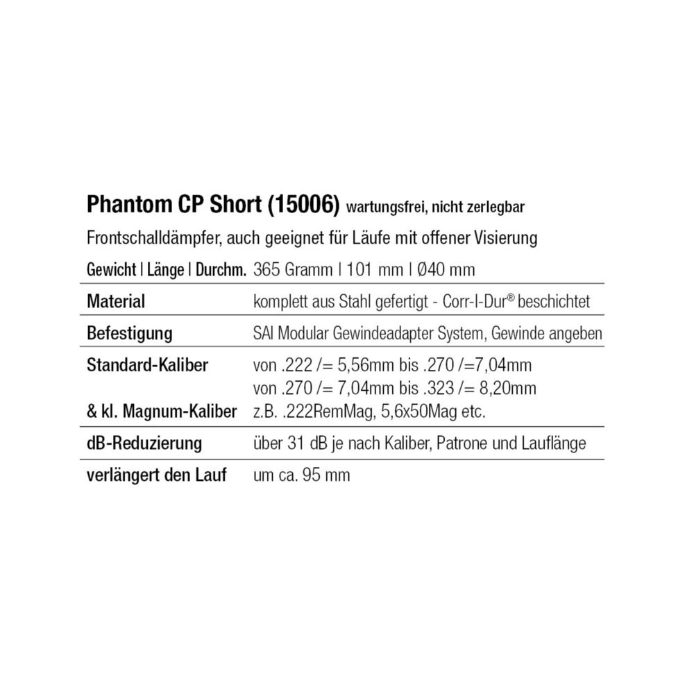 Das Modell Phantom - auch bekannt als PP40 - ist ein von SAI entwickelter Schalldämpfer, der auf Grund jahrelanger Tests und wissenschaftlicher Messungen von Schall, Frequenz und Schallwellenlänge eine außerordentlich hohe Dämpferleistung garantiert. Er wird verwendet auf einläufigen Büchsen, wie z.B. Repetier- oder Selbstladebüchsen. Sein schlankes Design und seine geringen Dimensionen in Verbindung mit einer Ganzstahlkonstruktion machen Ihn zu einer hervorragenden Wahl für Jäger und Behörden. Der Phantom wird komplett aus Stahl gefertigt und ist Corr-I-Dur® beschichtet und dadurch äußert robust und langlebig.