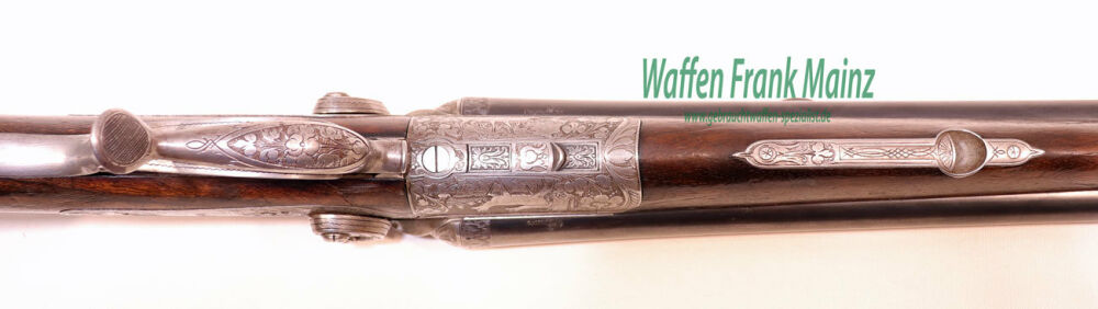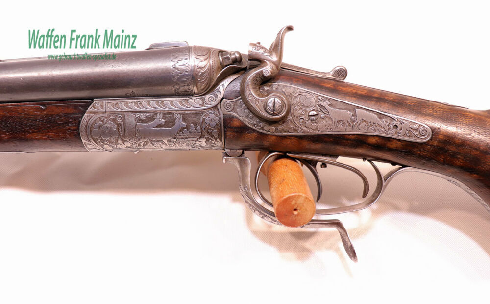 klassischer Hahndrilling, bereits mit Rückspringerschlösser, mit doppelter Laufhakenverriegelung und Linsenkopf-Verschluss, mit unten liegendem Öffnungshebel, Originalzustand, Läufe zum Teil mit Blankstellen, rechter Schrot- und Kugellauf teilweise rau, im rechten Schrotlauf sichtbare, flache Narbenbildung, Verschluss noch fest, Montageplatten für ausgekröpfte Suhler Einhakmontage noch vorhanden, ZF nicht mehr vorhanden, zusätzlich eingelassenes Dioptervisier, Kugelumschaltung auf der Scheibe, tiefe Jagdstückgravur mit flächendeckender Blattarabeskeneinrahmung auf System und Bedienteilen einschl. Schaftmagazin, gut gemaserter Originalschaft mit langgezogener bayrischer Backe, Fischhaut abgewetzt, mit sichtbaren Kratzern und Dellen, Schaftlänge einschl. original Hornkappe 345mm, (passende Munition für Schrot- und Kugel ab Lager)......ein Stück mit sehr viel Restaurierungspotenzial.....