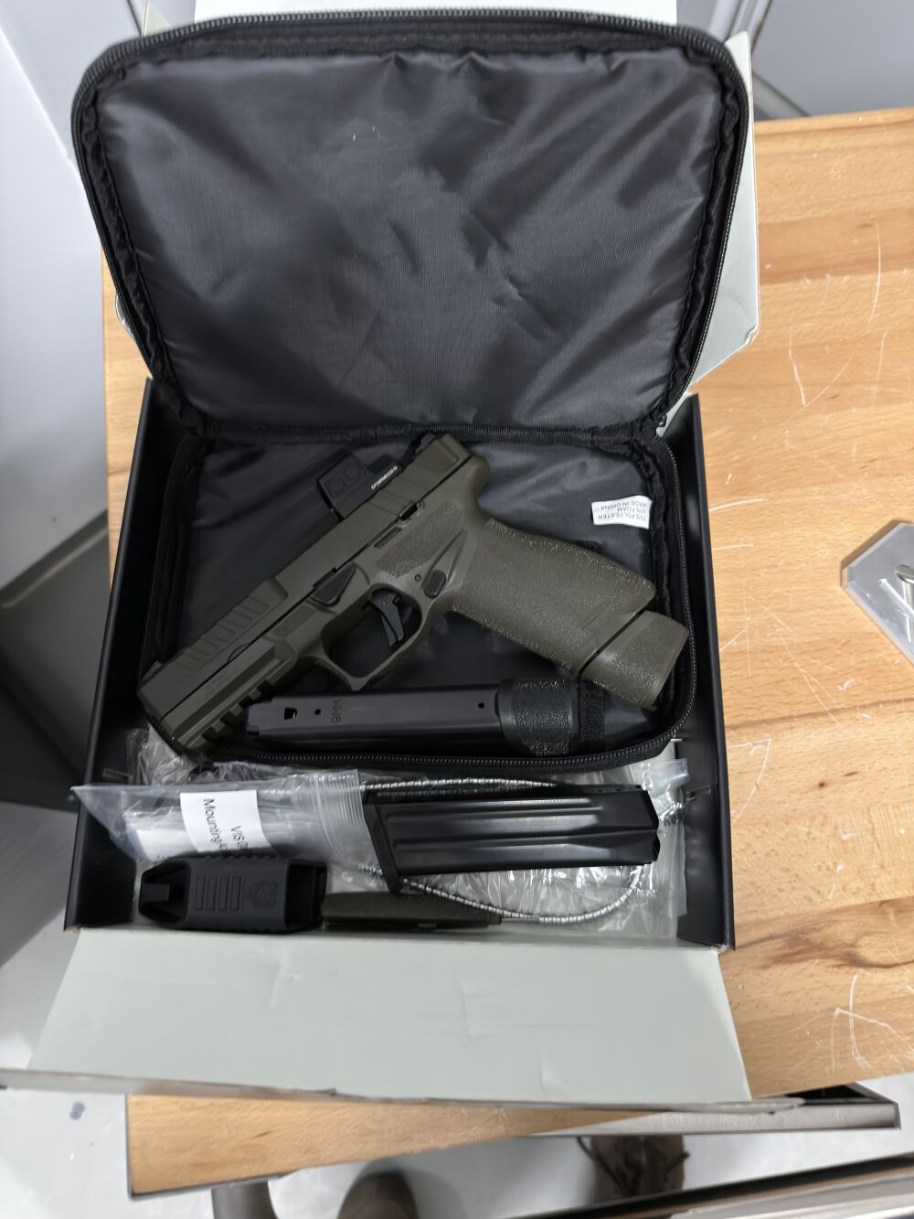 Kaliber 9mmLuger, ha.Pistole Echelon ODG Optic Ready 20+1 Patronen OD Green Cerakote Finish, Melonite® Finish Lauflänge 4,5Inch/11,43cm, 1/ein Magazin 17/siebzehn Patronen und 1/ein Magazin 20/zwanzig Patronen, Tac U-Dot Visier Fixed U-Notch weiß mit Night Visierkorn grün und Dot gelb umrandet, Griffstück Größe Medium Polymer OD Green, Schlitten Variable Optic-Ready Billet Machined Stahl Desert OD Green, Lauf aus geschmiedetem Stahl, Gesamtlänge 8Inch/20,32cm, Gesamtgewicht 23,9oz/669gramm ohne Munition, 2/zwei extra Griffrücken verschiedene Größen, 1/eine Magazinladehilfe, 1/ein Komplettes Pin Set für das Echelon Variable Interface System für 30 Optiken und 1/eine Aufbewahrungstasche Nylon schwarz, Code EC9459G-U Springfield Armory USA bei HS Produkt Kroatien.