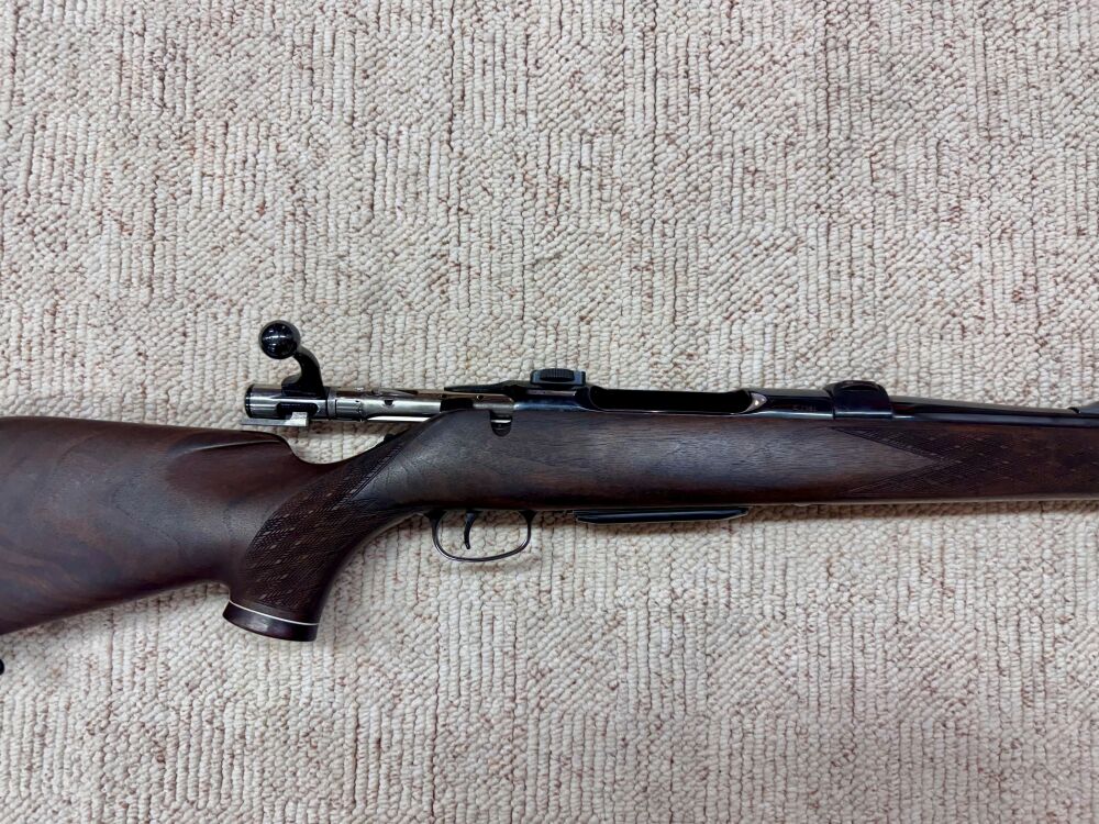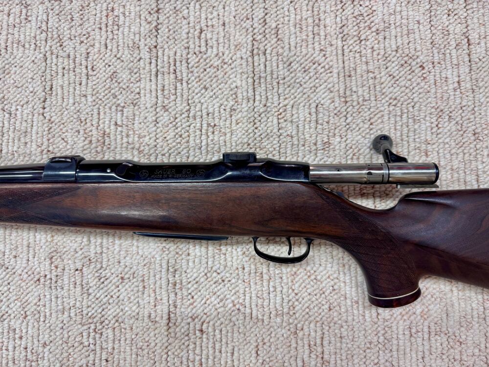 Es handelt sich um eine Repetierbüchse von Sauer im Kaliber 7 mm Rem. Mag. Ausstattung: Lauflänge: 66 cm Schaftlänge: 36,5 cm Basen: Suhler Einhakmontage Offene Visierung Französische... ...weiterlesen