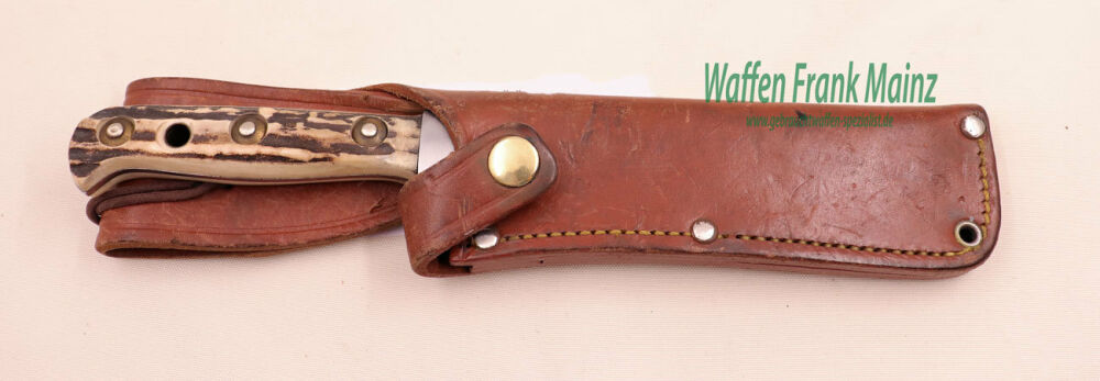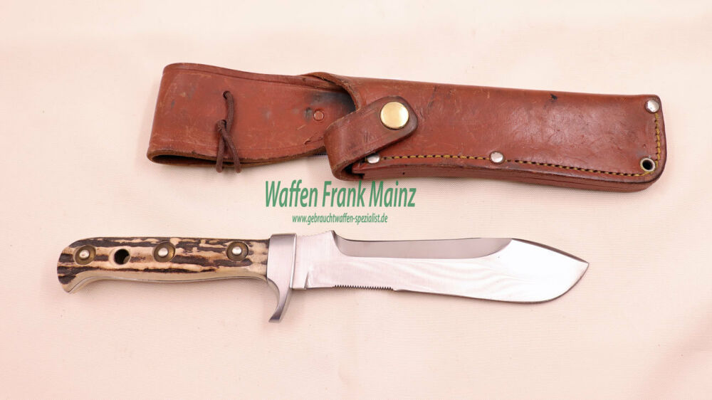 noch in klassischer Solinger Handarbeit gefertigt, Klinge fachlich überpoliert, Härteprüfstempel noch sichtbar, gut in der Hand liegende Hirschhornbeschalung mit Messingöse für Fangriemen, in der Original Ledersteckscheide....Schon Old Shatterhand in der Winnetou-Verfilmung "der Schatz im Silbersee" 1962 trug dieses elegante und doch unverwüstliche Stück aus der Messerhochburg Solingen, das White Hunter Jagdmesser entstand aus einer Zusammenarbeit des Solinger Puma Werks und der ostafrikanischen Jagdorganisiation EAPHA in den 1950er Jahren......