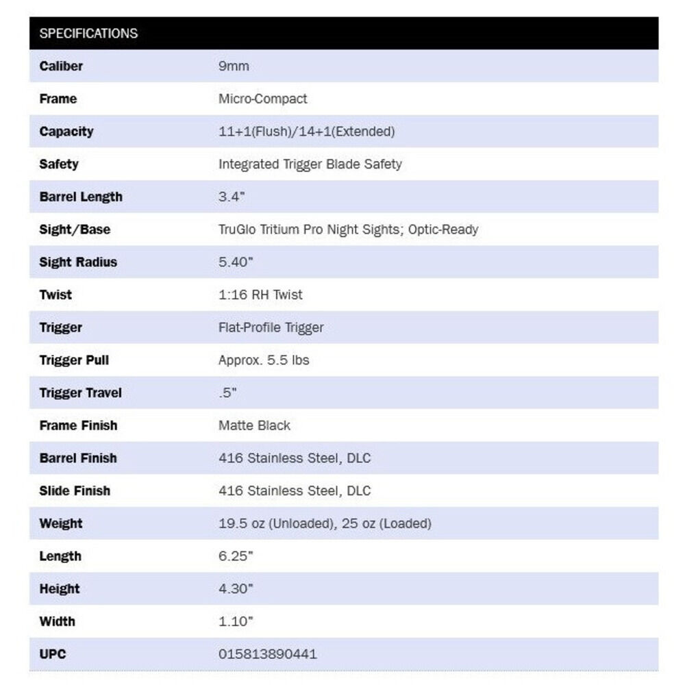 Kaliber 9mmLuger, ha.Pistole Modell MC2sc Micro-Compact Optic-Ready schwarz brüniert matt 11+1(14+1) Patronen, Lauflänge 3,4"/8,6cm, Truglo Night Visierung 3-Dot fix, Abzugssicherung, Abzugsgewicht ungefähr bei 5,5lbs/2.497gramm ab Werk, mit 1/einem Magazin 11 Patronen schwarz und 1/einem Magazin 14 Patronen schwarz mit Verlängerung, Gesamtgewicht 19.5oz/553gramm ohne Munition, Gesamtlänge 6,25"/15,9cm, mit Kabelschloss und Bedienungsanleitung, Code 89044 Mossberg USA. Preis gültig für 1/eine Pistole Code 89044! - Neu 2022