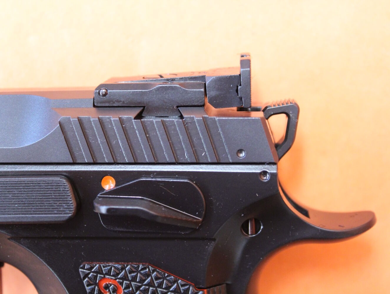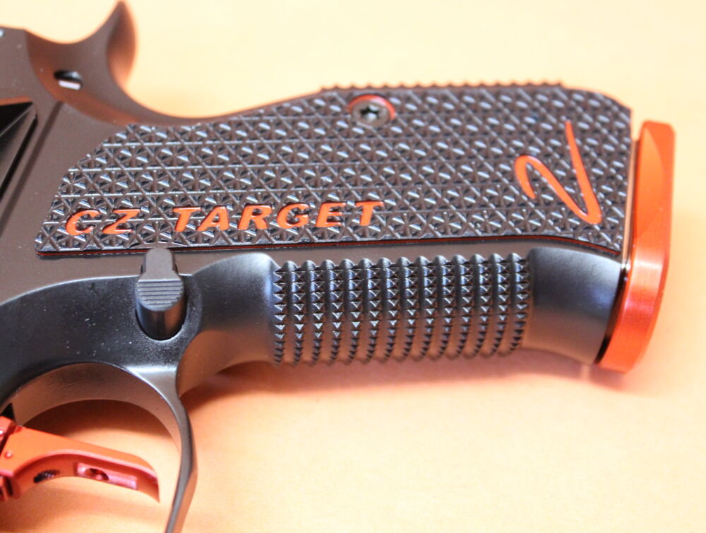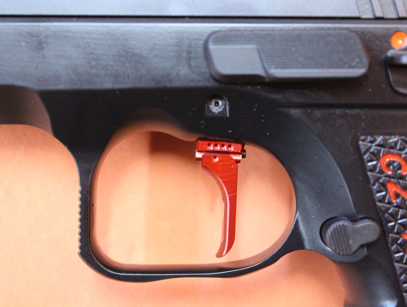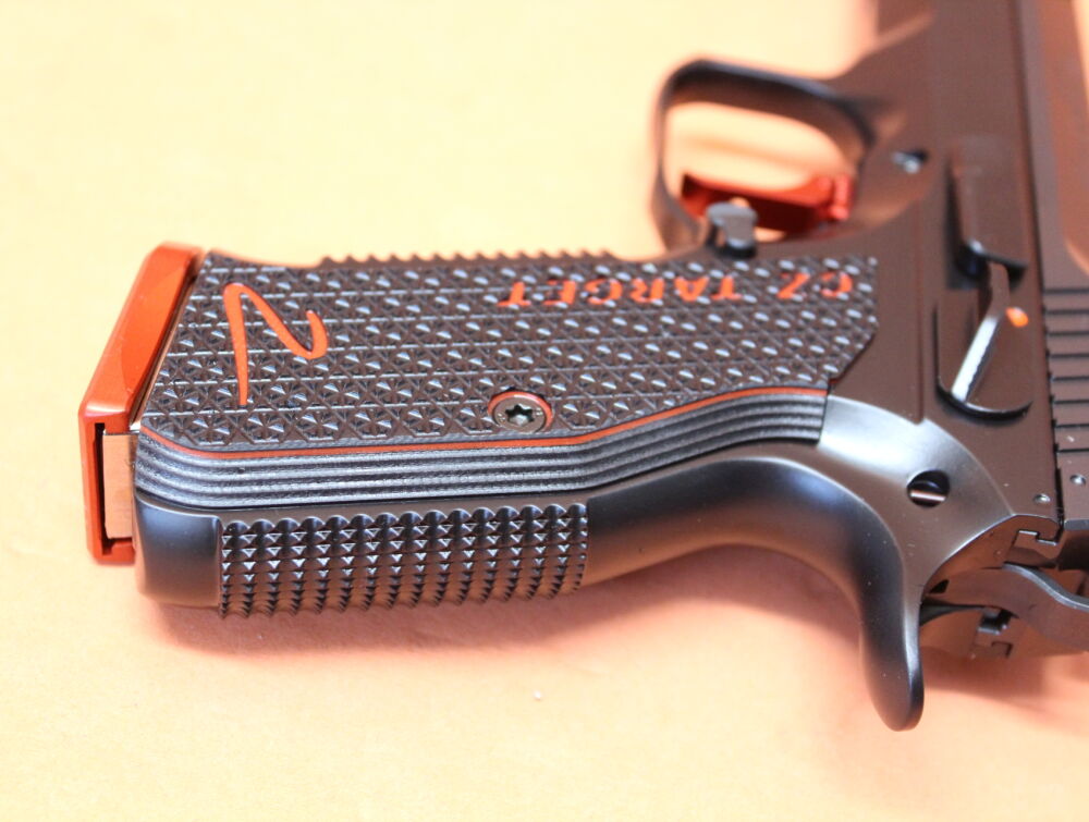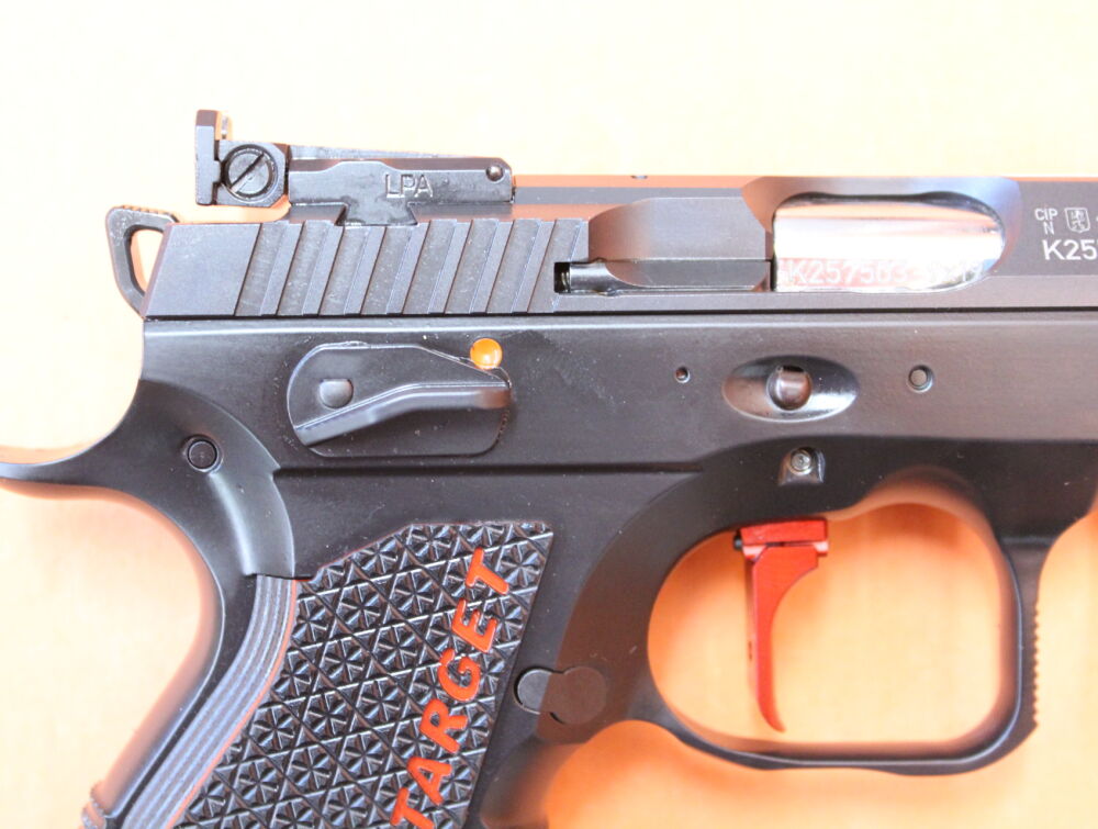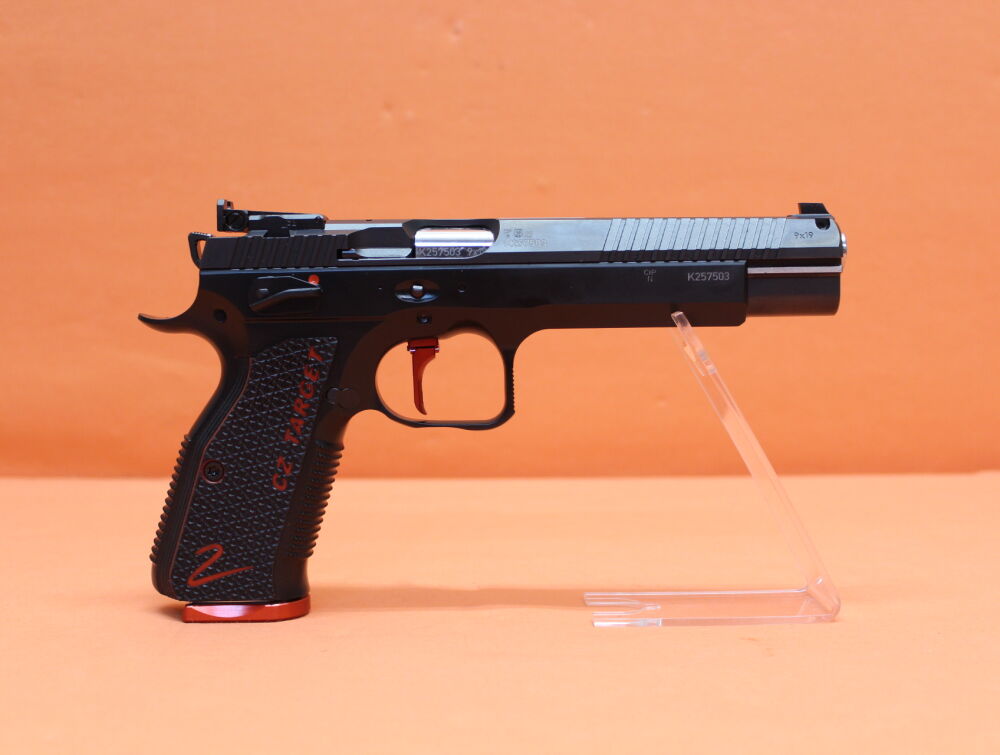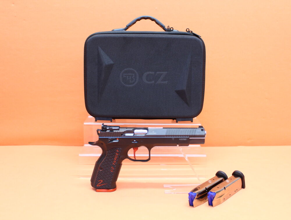 System CZ 75, 153mm Lauf, Sportkorn, LPA-Mikrometervisierung, Griffstück mit langem Dustcover (OHNE Zubehörschiene), vergrößerter Schlittenfanghebel, beidseitiger vergrößerter Sicherungshebel, einstellbarer SA Abzug (ca. 5 - 20N/ Auslieferzustand ca. 10N) mit einstellbarem Triggerstop/ Züngelposition (OHNE Schlagbolzensicherung), schwarz/rote G10-Griffschalen, 17-Schuß Magazin (@). Incl. 2 Stück Reservemagazine/ Reinigungsset/ Ersatzpuffer/ Ersatzkorn. Textilkoffer als Transportverpackung.