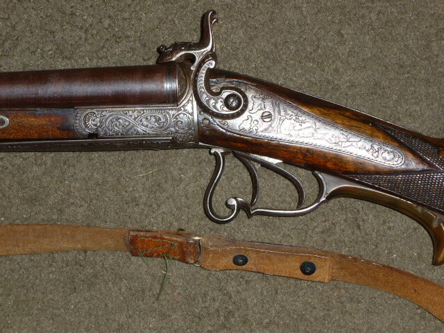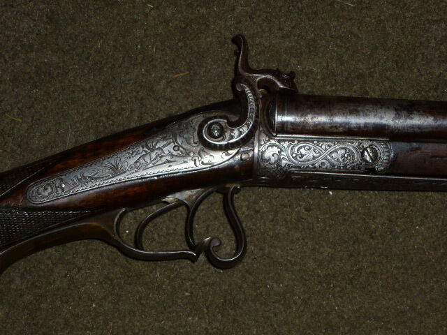 gebrauchte Lefaucheux Hahndoppelflinte, gez. Harry A. Dillon June 1873, Kal. 16/65, Damastläufe, Lauflänge 73 cm, Schaftlänge 35 cm ...weiterlesen