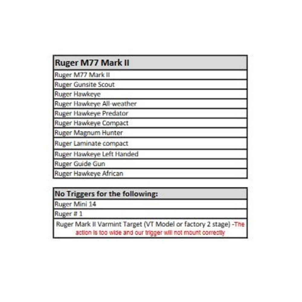Rep.Büchse/Rifle Ruger Modell M77 MKII und/oder Hawkeye nicht für Modell 2-Stage Varmint geeignet siehe Tabelle unter Bilder, Abzug Kit Solid gebogen STS-Stainless Steel RH-rechte Hand, verstellbar von 1,5lbs/681gramm bis 2lbs/908gramm, beinhaltet Abzug, Sear, Feder zur Reduzierung des Abzuggewichtes und Inbusschlüssel, Code 1100 Timney USA. Nacharbeiten sind in der Regel nicht erforderlich - eine fachgerechte Montage wird empfohlen!