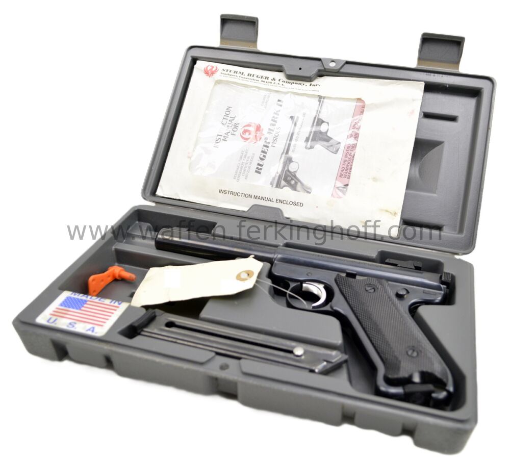 Caliber .22lr, se.Pistol Ruger Model Mark II Target Black 10+1 Rounds, barrel length 5.5Inch/14cm, rear sight adjustable height and side, 2/two magazine 10/ten rounds, Instruction Manual, Original storage box, 2/two Aimtech grip mounts Original Box Code APM-5 unused, CIP Germany, Ruger USA, used condition 1-2. Sale by private - tax not reportable - Unique piece!