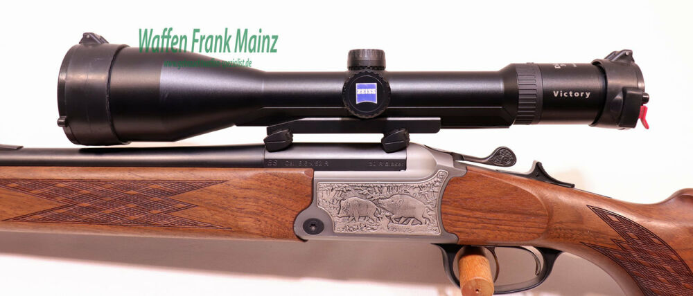 selten geschossene Schrankwaffe, mit dem patentiertem Zweischloss-Sicherheits-Handspannersystem, mit Doppel-/Feinabzug, eingelegte Jagdstückmotivplatten, rechts Rehwild, links Schwarzwild, in grau eloxiertem System, bereits mit freiliegenden, mechanisch verstellbaren Läufen für perfektes Zusammenschießen, Blaser Sattelmontage mit ZF Zeiss Victory Diavari M 3-12x56 T*, mit beleuchtbarem Dämmerungsabsehen (noch aus deutscher Qualitätsfertigung), klassischer Nussbaumschaft mit langgezogener, bayrischer Backe für Rechtsschützen, mit schottischer Fischhaut, Schaftlänge 340mm inkl. Gummikappe