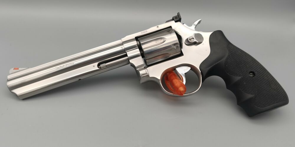 Gebrauchter Taurus Revolver in sehr gutem voll funktionsfähigem Zustand. Stainless. Korn mit roter Kontrasteinlage und Kimme mit großem Kimmenblatt. Kimme verstellbar. Gummigriffschalen. Sehr guter Schlossgang. Keine gröberen Kratzer/Beschädigungen. Beschuss 1991. Deutlich bessere Verarbreitung als heute bei Taurus zu beobachten. Wenig Schussbelastung. Magnumrille quasi nicht sichtbar.