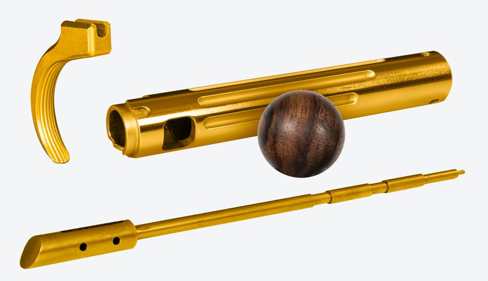 Die 1782 Gold Line strahlt Eleganz und Einzigartigkeit aus und beeindruckt durch ein exklusives Erscheinungsbild. Die goldfarbenen Systembauteile sind titannitriert (TIN). Diese optisch sehr ansprechende Titannitrid-Schicht ist dank ihrer Vielseitigkeit und ihrer ausgewogenen Eigenschaften eine seit Jahrzehnten bewährte Allround-Beschichtung. Die attraktive, goldene Farbe und die hohe Abriebfestigkeit dieser Beschichtung eignen sich hervorragend für die stark beanspruchten Komponenten Verschlusshülse, Schlagbolzen und das Abzugszüngel. Abgerundet wird dieses exklusive Gesamtpaket mit einer eleganten Kammergriffkugel aus schön gewachsenem Nussbaumholz sowie den ausgesuchten Premium-Schaftholz.