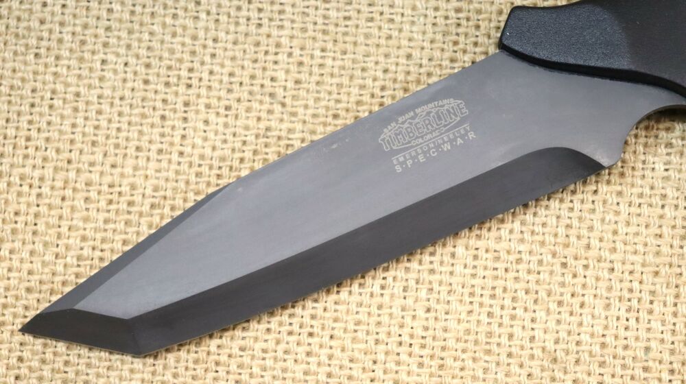 Dieses Specwar Fixed Blade von Timberline Knives verfügt über eine schwarze Tanto-Klinge mit Meißelschliff (60 HRC),