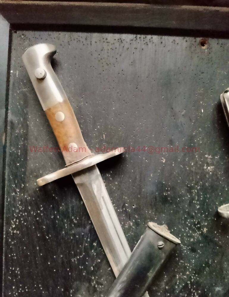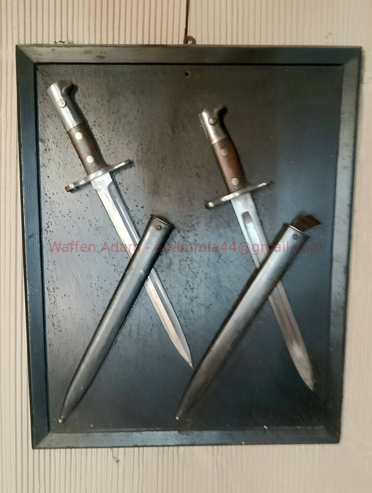 Altes Wandbild aus Sammlung von verschiedenen Blankwaffen, mit original schweizer Bajonetten, frühes M11 und K31 Bajonett mit zugehörigen original Scheiden . Diese montiert auf schwarzem Holzrahmen und können bei Bedarf wieder entfert werden. Hersteller der Bajonette nicht genauer bestimmt. Elsener / Wenger / Victorinox ? , reinigungsbedürftig