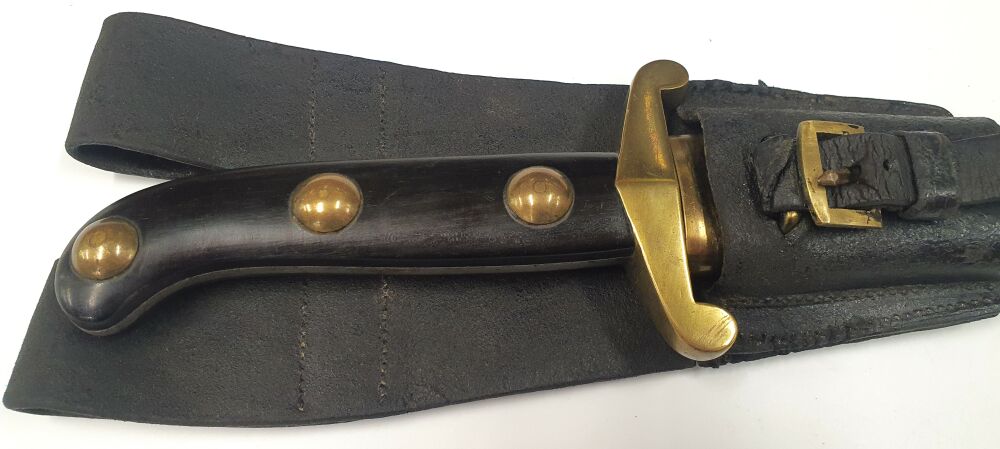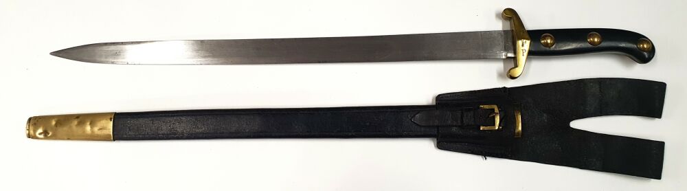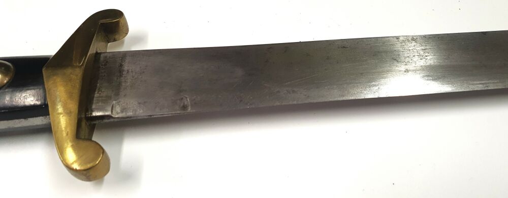Weidmesser eidgenössische Ordonnanz für Scharfschützen Erscheinungsjahr: 1842 Zustand: kaum Gebrauchsspuren, keine Rostnarben, Scheide intakt mit intaktem Gehänge, Messingspitze der Scheide... ...weiterlesen