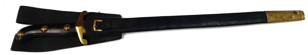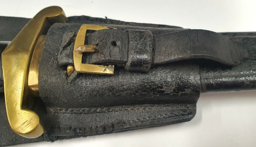 Zustand: kaum Gebrauchsspuren, keine Rostnarben, Scheide intakt mit intaktem Gehänge, Messingspitze der Scheide mit Dellen