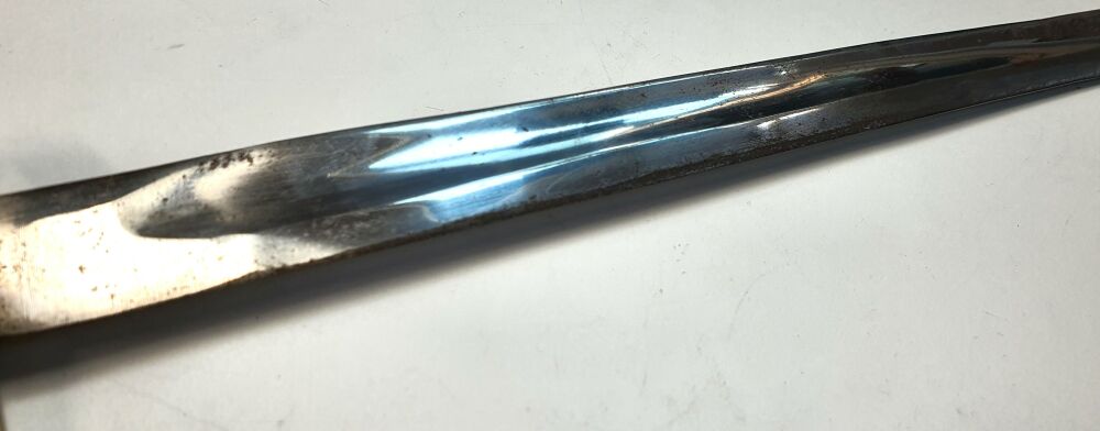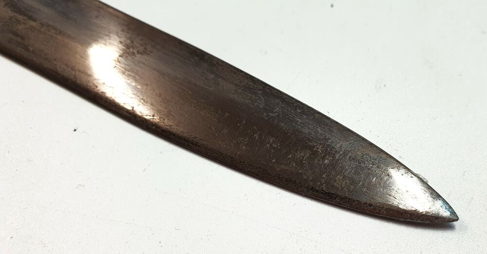 Die Klinge weist leichte Rostspuren und Kratzer auf, eine Folge von Alter und Gebrauch.