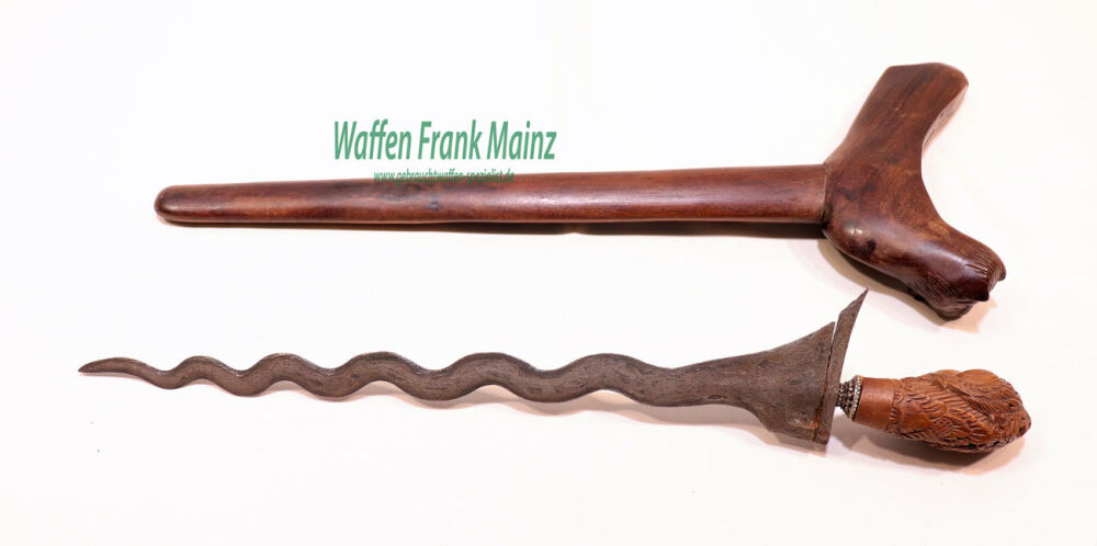 Ehrenkries mit geflammter Mondeisen-Damastklinge, Griff und Scheide mit hochwertiger Holzverschneidung....vermutlich aus dem indonesisch/malayischem Raum, sehr dekorativ...