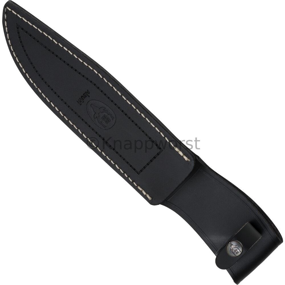 Die Klinge ist aus rostfreiem Molybdän-Vanadium Stahl. Der rutschfeste Gummigriff hat eine kräftige Parierstange aus Stahl. Mit Lederscheide.