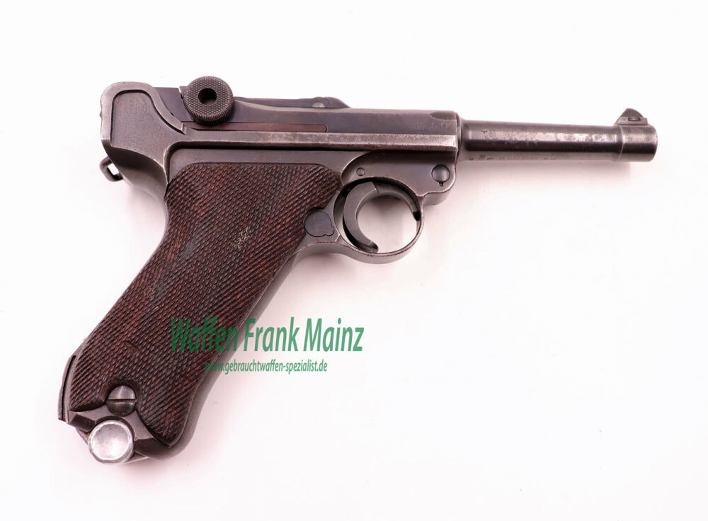 aus Sammlungsauflösung, Originalzustand, nummerngleich außer Magazin, jedoch dieses stammt aus dieser Zeit mit Aluminiumboden und WaA-Abnahme, mit gültigem, englischem Nachkriegs- Zivilbeschuss, Waffe wurde vermutlich als Kriegshilfe für die italienische Armee gefertigt, da der Originallauf auch sichtbare Wehrmachtsabnahme-Stempelung hat, Kanten der Stahlteile linksseitig durch Tragen im Holster blank gewetzt, rechts leichte Patina, die jedoch nicht überarbeitet wurde (daher noch Restaurierungspotenzial vorhanden), gut sichtbare Beschriftung und Bestempelung, sowie Code "byf" auf dem Verschluss.....somit ein Stück zum Sammeln und Schießen (da die vorhandene Patrone 7,65Luger in Präzision die 9mm deutlich übertrifft, deshalb wurde die Schweizer Armee erst im Laufe der 70er Jahre auf 9mm umgerüstet)....(diverse Munitionshersteller und Sorten ab Lager)
