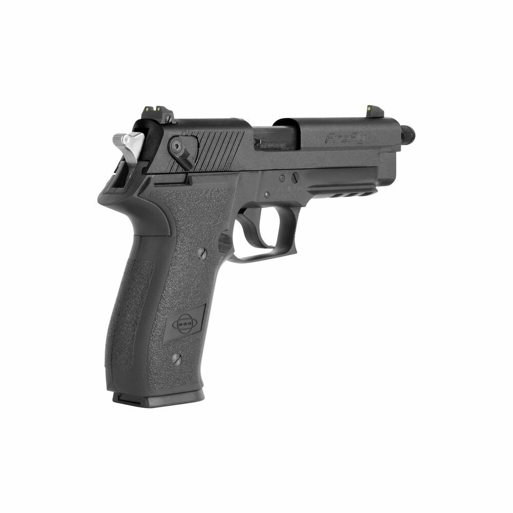 Die GSG FireFly Selbstladepistole im Cal. .22 mit Polymer-Griffstück und schwarzen Kuststoffgriffschalen verfügt über ein Laufgewinde, ein Metall-Magazin, eine einstellbare Visierung, einen Double-Action Abzug, eine Picatinny-Schiene, eine beidseitige Flügelsicherung und ein ergonomischem Griffstück.
