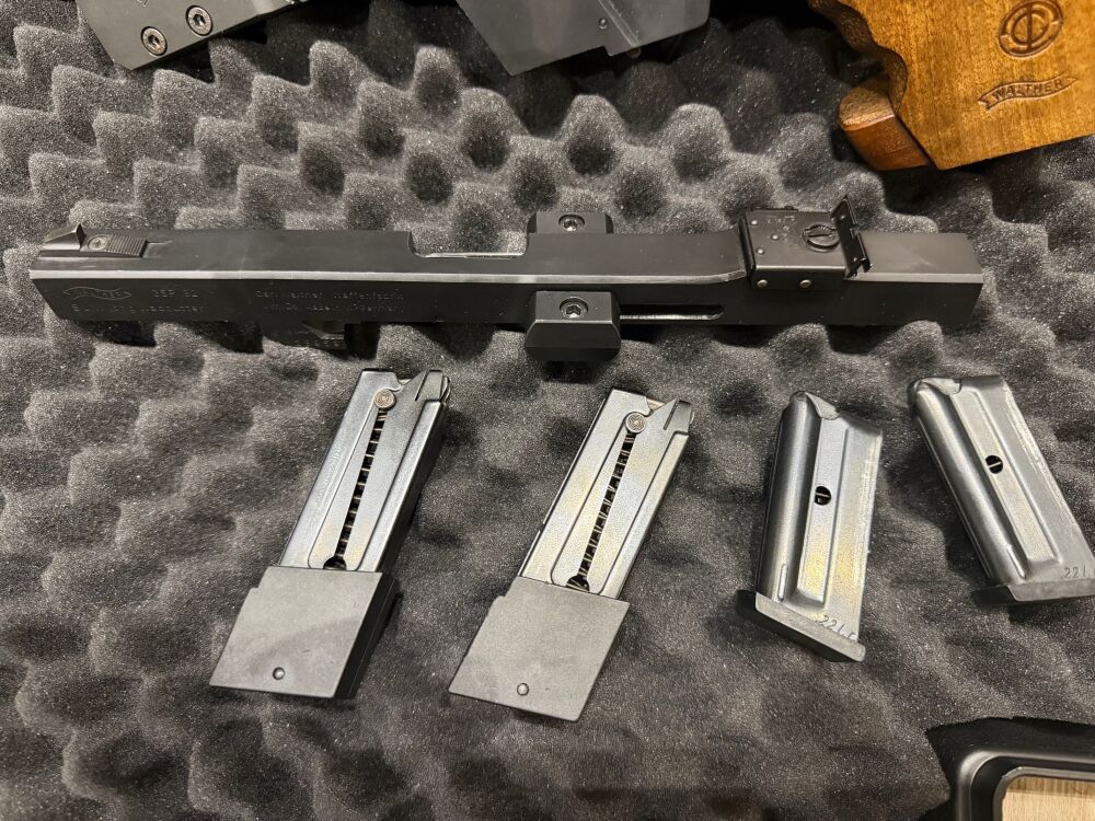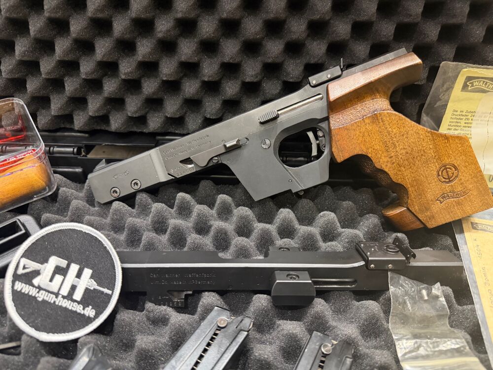 Hier kann man sich ein tolles Komplettpaket sichern! Die Walther GSP mit 4,5 Zoll Lauf kommt in einem guten Zustand aus 2. Hand und ist Baujahr 02 mit Beschuss aus Ulm.