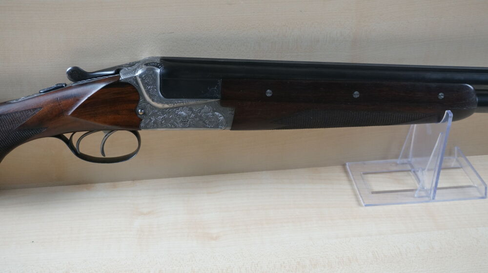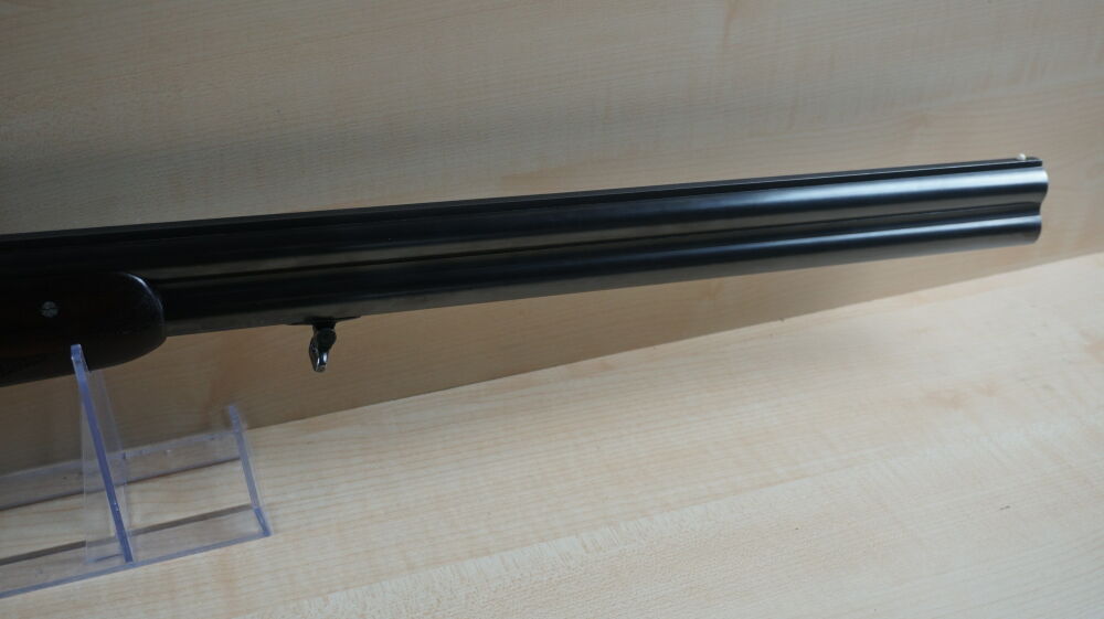 Bockdoppelflinte Merkel im Kaliber 12 / 70 mit Doppelabzug, Ejektoren, Lauflänge 71 cm, Schaftlänge 37 cm.