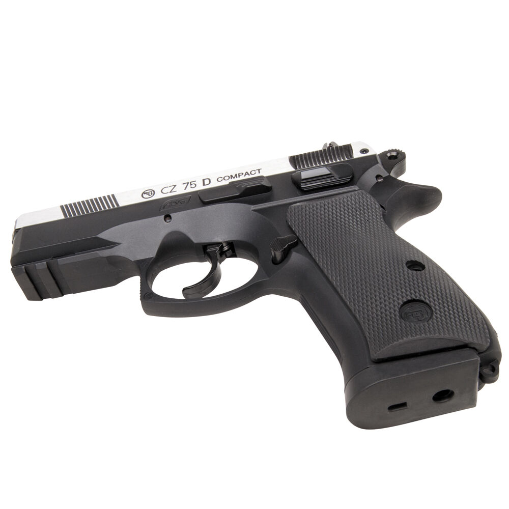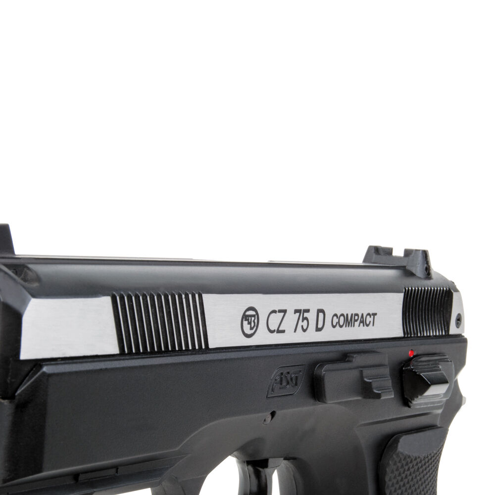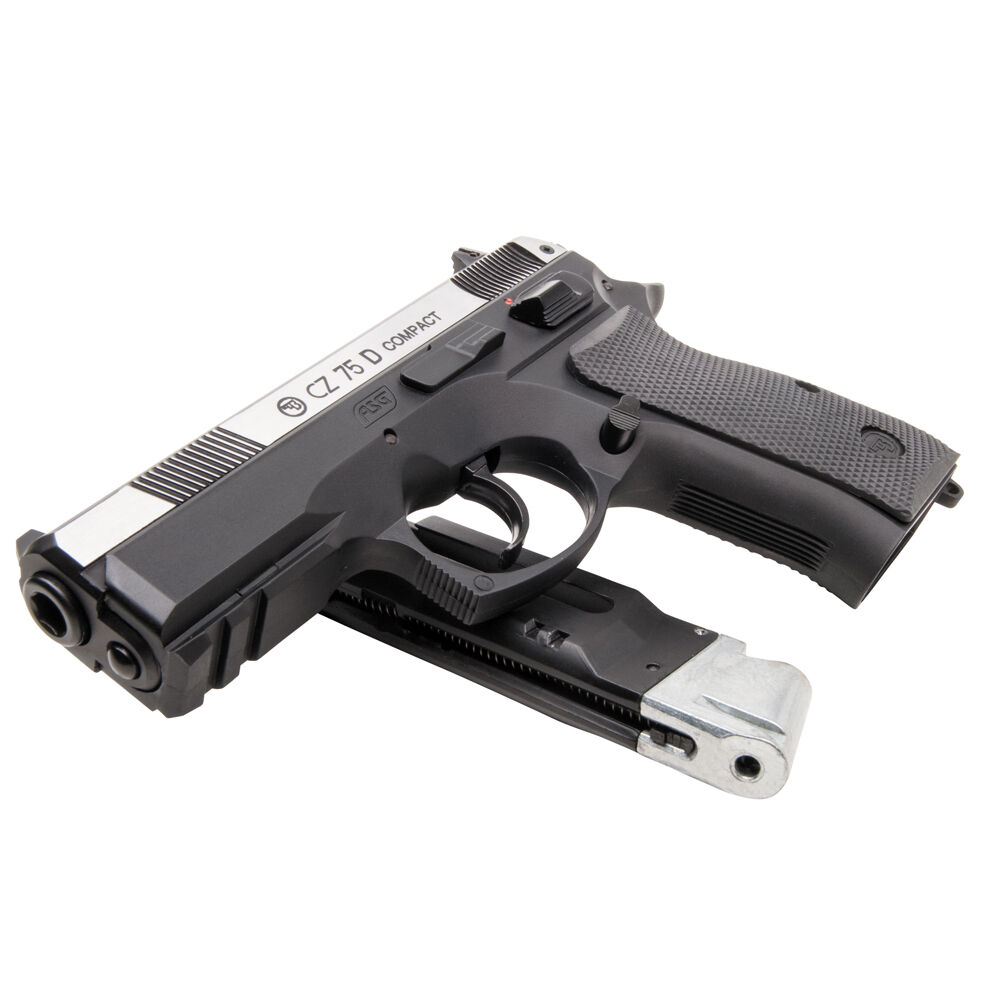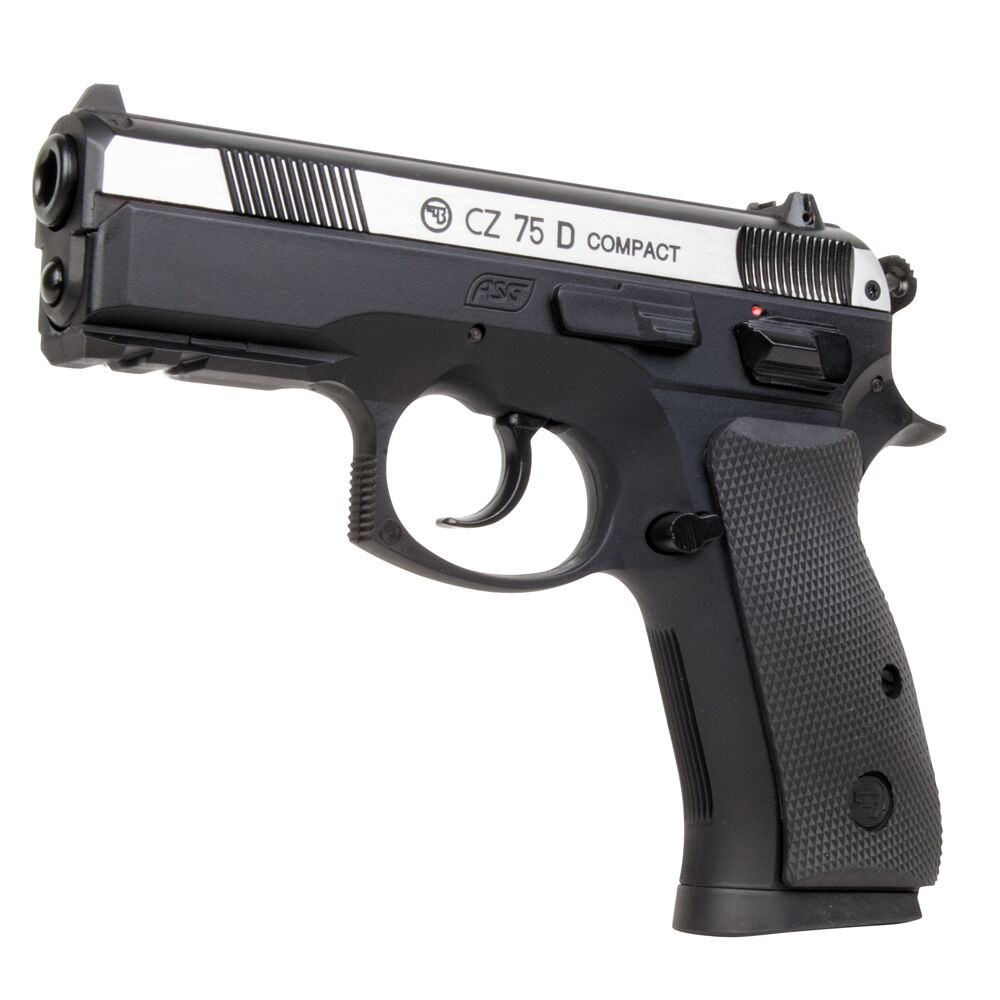 Bei der von ASG produzierten Co2 Replik handelt es sich um eine Nachbildung der Brünner CZ 75D Compact. Die Pistole wird mittels Gas betrieben. Dieses wird durch eine handelsübliche 12g Co2 Kapsel erzeugt. So steht eine maximale Energie von bis zu 2,7 Joule bereit. Bei dieser Ausführung der CZ 75 wurde auf ein Blow Back System verzichtet. So steht das Gas vollständig für den Schuss zur Verfügung. Das Magazin nimmt neben der co2 Kapsel noch 17 Kugeln im Kaliber 4,5mm BB auf. Die CZ 75D Compact Co2 NBB verfügt über ein Hop-Up System welches der Waffe eine bessere Präzision verleiht. Die manuelle Sicherung wurde vom Vorbild übernommen. Die CZ 75D Co2 Pistole verfügt über einen Double Action Abzug sowie eine einstellbare Kimme. Diese Version der Waffe wurde mit einem Farbkontrast ausgestattet. Die schwarze Grundwaffe wurde mit einem silbernen Schlitten kombiniert.