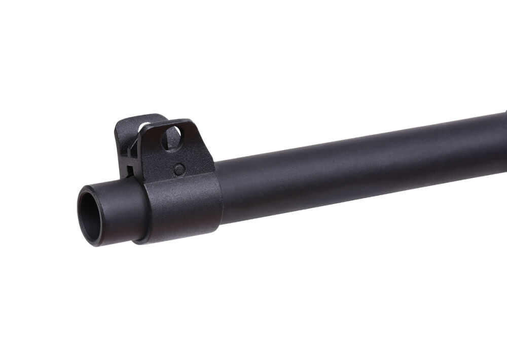 Der Upper Receiver wird aus Metall gefertigt, der Schaft besteht aus einem schlagfesten Kunststoff in Holzoptik. Die hintere Visierung ist einstellbar. Der Nachbau ist im Kaliber 4,5mm BB