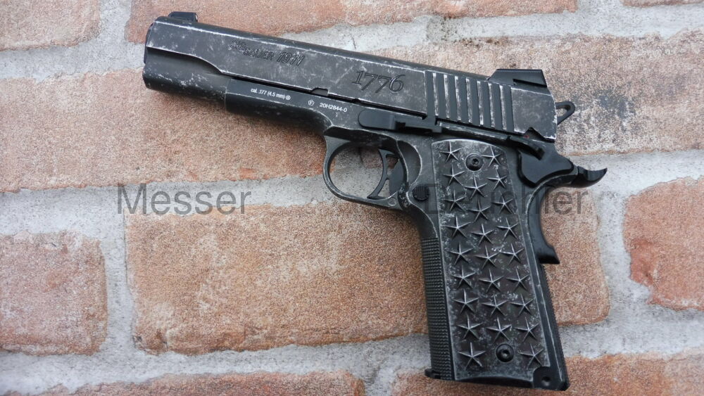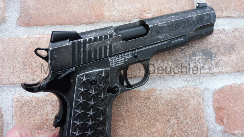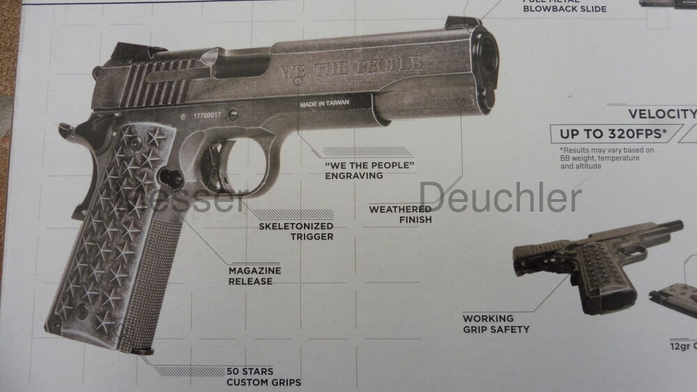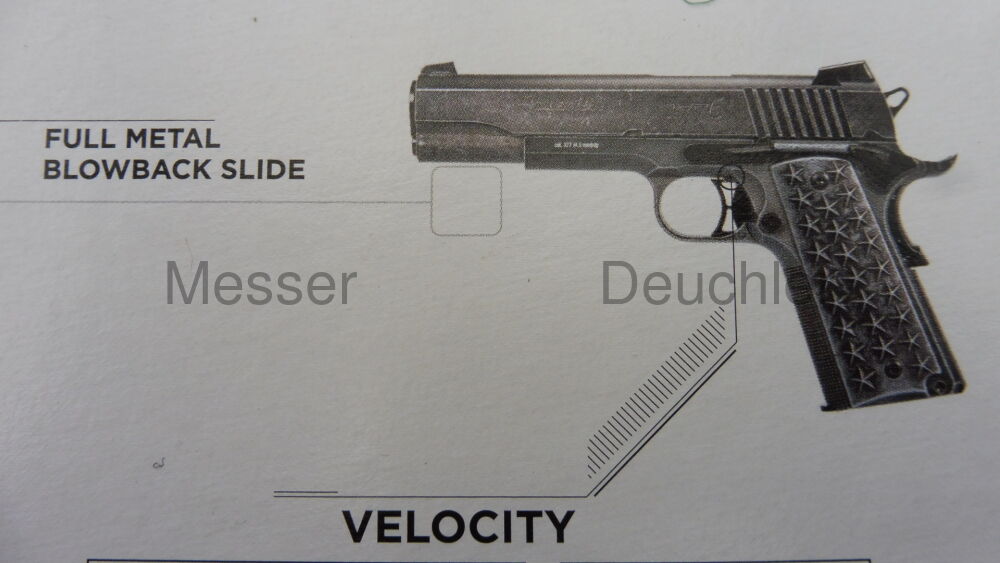 Inspiriert von der außergewöhnlich populären 1911 verfügt die BB-Pistolenversion dieser einzigartigen amerikanischen Pistole über Griffschalen mit 50 Sternen (25 pro Seite), welche die Staaten der Union repräsentieren. Der Edelstahl-Schlitten und das Griffstück wurden mit einem Distressed-Finish veredelt.