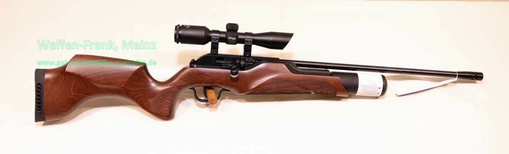 Innen arbeiten zuverlässig ein präzise gefertigtes Pressluft-System – Made in Germany. Über den großzügigen Repetierhebel werden die Diabolos aus dem 8-schüssigen Aluminium-Trommelmagazin in den Lauf aus der Fertigung von Lothar Walther geführt. 500 mm lang und mit einer Mündungsbremse samt 1/2“ UNF-Gewinde versehen, gewährleistet er eine stabile Flugbahn und lässt Schalldämpfer zu. Die Energie liefert der fest verbaute Pressluft-Tank mit 230 bar-Technik und integriertem Füllventil und Manometer. Für persönliche Bestleistungen ist der Vorzugsweg des Abzugs einstellbar.