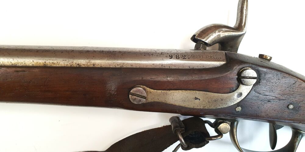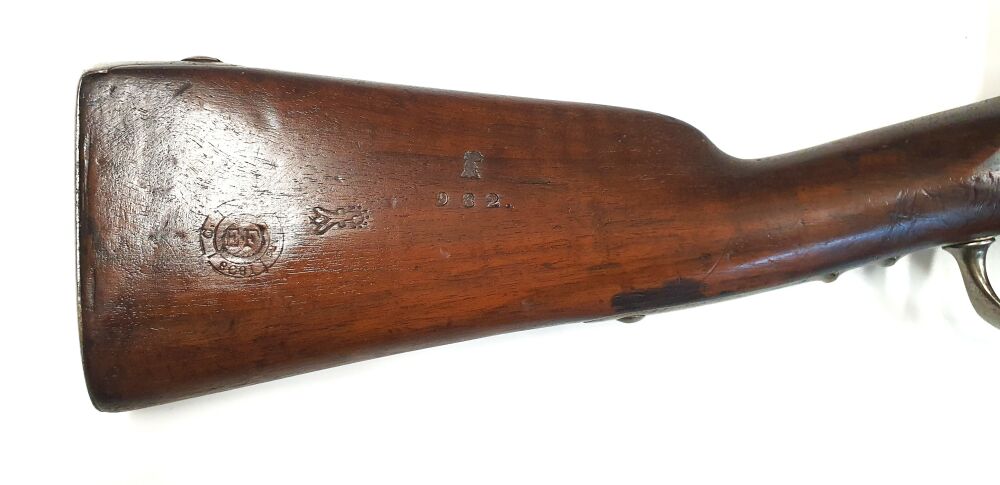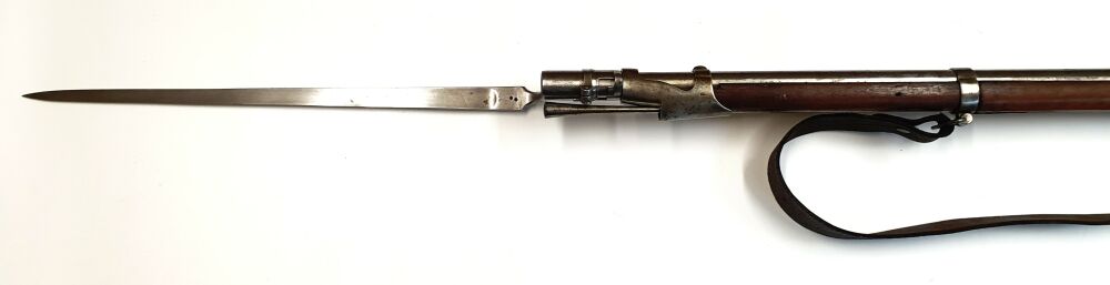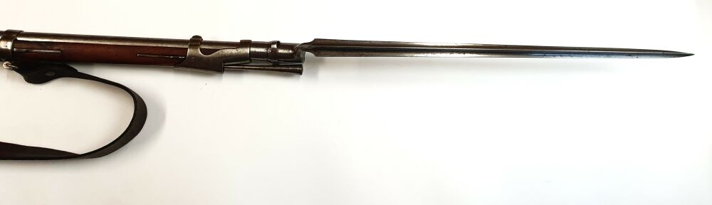 Dieses Exemplar befindet sich in einem guten Zustand mit leichten Gebrauchsspuren und verfügt außerdem über ein Bajonett und Lederriemen.