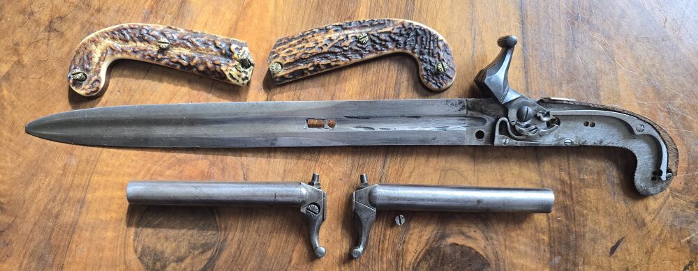 Jagdmesser mit 2 schüßiger Percussions Pistole um 1850. Klingenlänge 27,5 cm,die vorderen beidseitig geschliffen.Links und rechts davon eine Percussions Pistole.Glatte Läufe 10 cm Länge.Die Parierstange an der Oberseite zugleich Hähne . Einabzug für