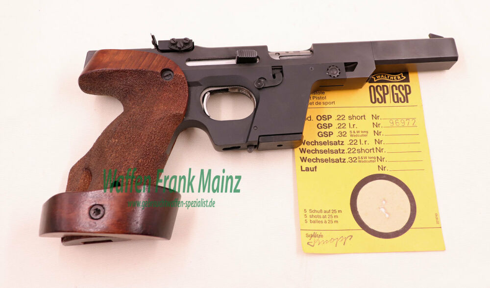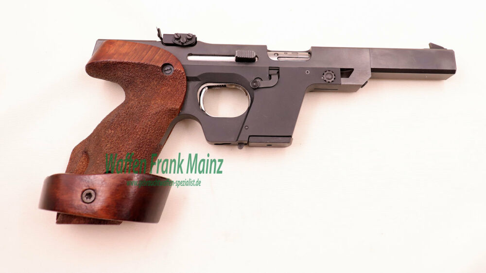 selten geschossene Schrankwaffe, bereits mit neuem, mehrfach verstellbarem Abzug und großem Magazinschacht für Wechselsystem in Kal. .32 S&W long WC und automatischer Schlittenfang, Original verstellbare Rechtsgriffschalen Gr. S-L, mit ausgesuchtem Werksschussbild und Bedienungsanleitung.....