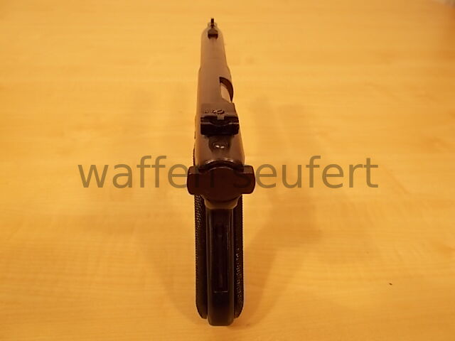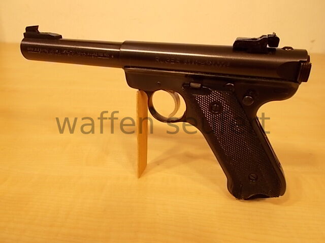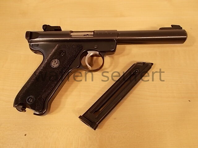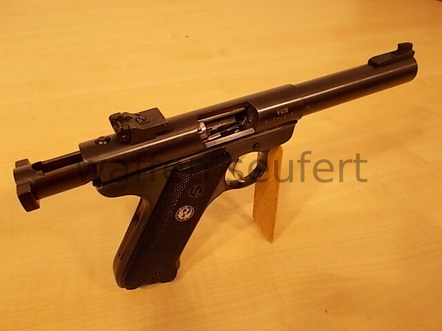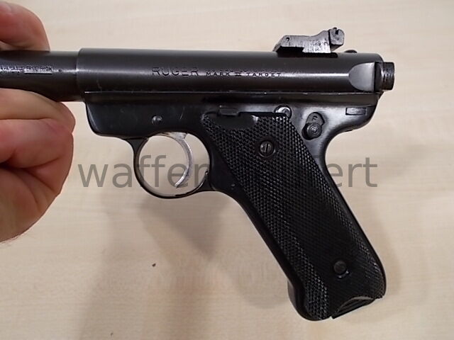 Ruger Mark II Sportpistole. Die berühmte Scheiben- und Silhouetten-Pistole vom amerikanischen Qualitätshersteller Ruger. Preisgünstige Sportpistole und Trainingspistole für 08 Ordonanzschützen. Eine der wenigen Sportpistolen noch in klassischer Pistolenform dadurch auch als präzise Jagdpistole für die Fallenjagd geeignet. Spiegelblanker Lauf, Züge und Felder scharfkantig. Präzise Ausführung von 1989. Das schräge Griffstück wurde der 08 Großkaliberpistole nachempfunden. Dadurch auch sehr gut als Trainingspistole von 08 Schützen im preisgünstigen 22er Kaliber einsetzbar. Besonders robust und zuverlässig. Der schwere 5,5“ Bull Barrel Lauf (Ø 20 mm) wirkt wie ein Laufgewicht und unterstützt ein ruhiges, gleichmäßiges Schießen. Brünierte Ausführung mit Targetvisierung, Kimme in Höhe und Seite fein einstellbar und hohes Balkenkorn. Mit Schlittenfanghebel, Sicherungshebel, breitem Abzugszüngel mit Triggerstopschraube und 10 Schuss Einsteckmagazin. Griffschalen aus schwarzem Hartgummi mit vollflächig geprägter Fischhaut für einen sicheren Griff. Gepflegter sehr guter Zustand. Mit Ersatzmagazin, Orig. Bedienungsanleitung und Orig. Verpackung. Kaliber: .22lr (.22LfB). Beschuss: Mellrichstadt 1989. Visierline ca: 20,3 cm. Lauflänge ca: 14,2 cm. Maße ca: 24,5 x 13,5 cm. Gewicht ca: 1,17 kg. Zum Kauf dieses Produkts ist die Vorlage der Erwerbsberechtigung erforderlich!