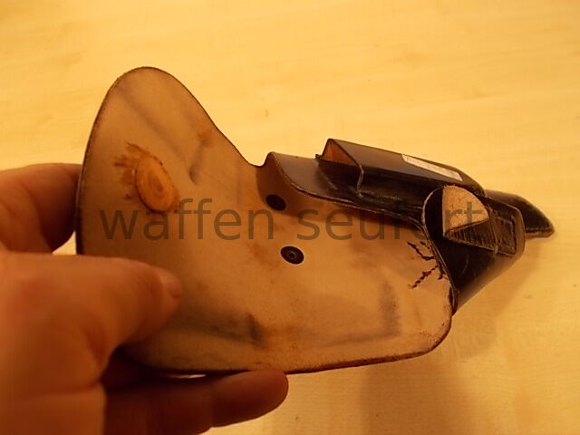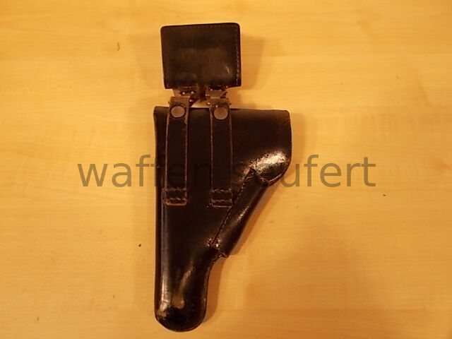 Pistolentasche der Deutschen Polizei für französische MAB D Pistole. Gefertigt in den 1950er Jahren für die Erstbewaffnung der Deutschen Polizei in der französischen Zone. Pistolentasche mit Halterung für Tragekoppel abnehmbar und zwei Gürtellaschen an der Rückenplatte für das Tragen am Gürtel. Tasche mit Klappe aus einem Stück Leder gefertigt mit aufgenähten Lederverschlußstück und Magazintäschchen für Magazin 7,65. Tasche mit leichten Gebrauchsspuren, poliertes schwarzes Glattleder etwas fleckig. Nähte und Leder sonst sehr gut erhalten.