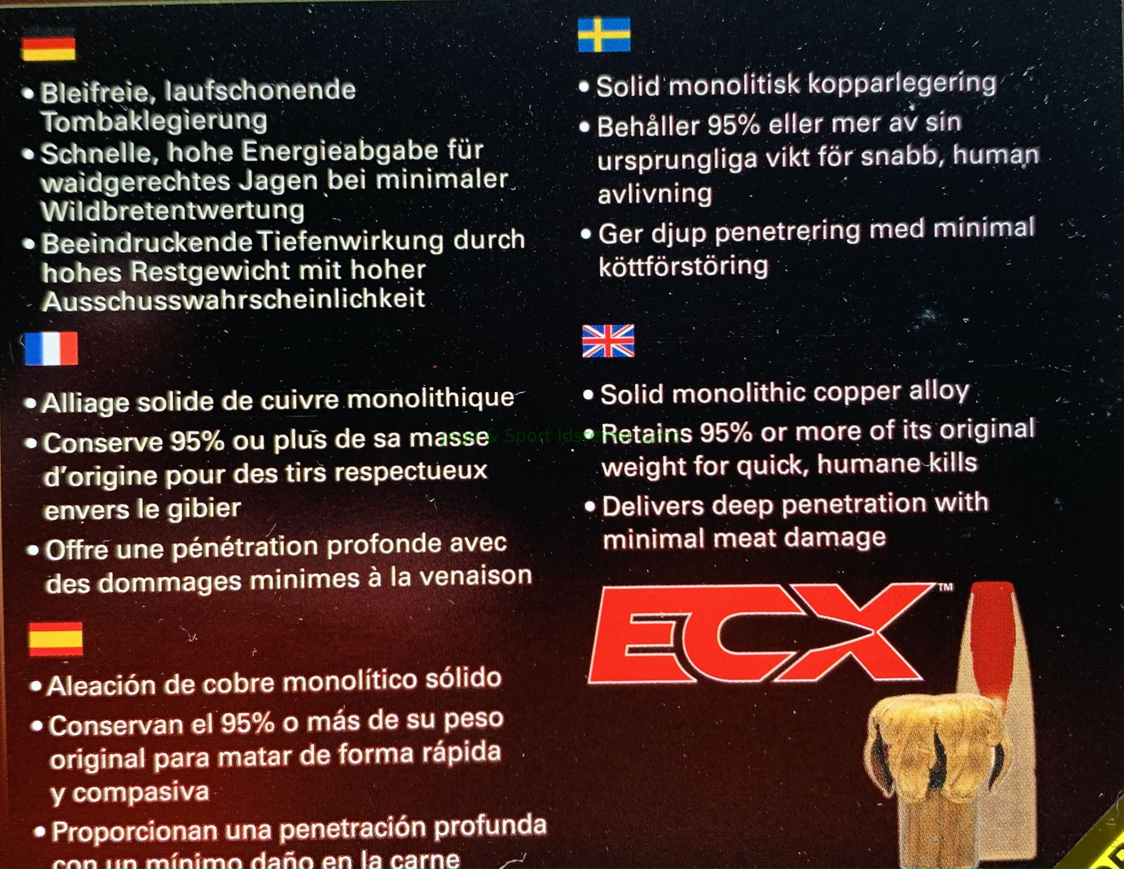 Bleifreies massestabiles Deformationsgeschoss. Das ECX-Geschoss (Extreme Copper Alloy expanding) ist ein monolithische, blei- und splitterfreie Geschoss abgestimmt auf Patronenlager und Laufabmessungen europäischer Hersteller. Das monolithische, bleifreie Geschoss aus einer Kupferlegierung (Tombak) liefert eine guteTiefenwirkung bei hohem Restgewicht, auch bei Knochentreffern. Die flache Kunststoffspitze sorgt für ein sicheres Ansprechen des Geschosses, auch bei niedrigeren Geschwindigkeiten. Die neuartigen Entlastungsrillen des ECX™-Geschoss verbessern die aerodynamische Leistung und reduzieren Laufablagerungen.