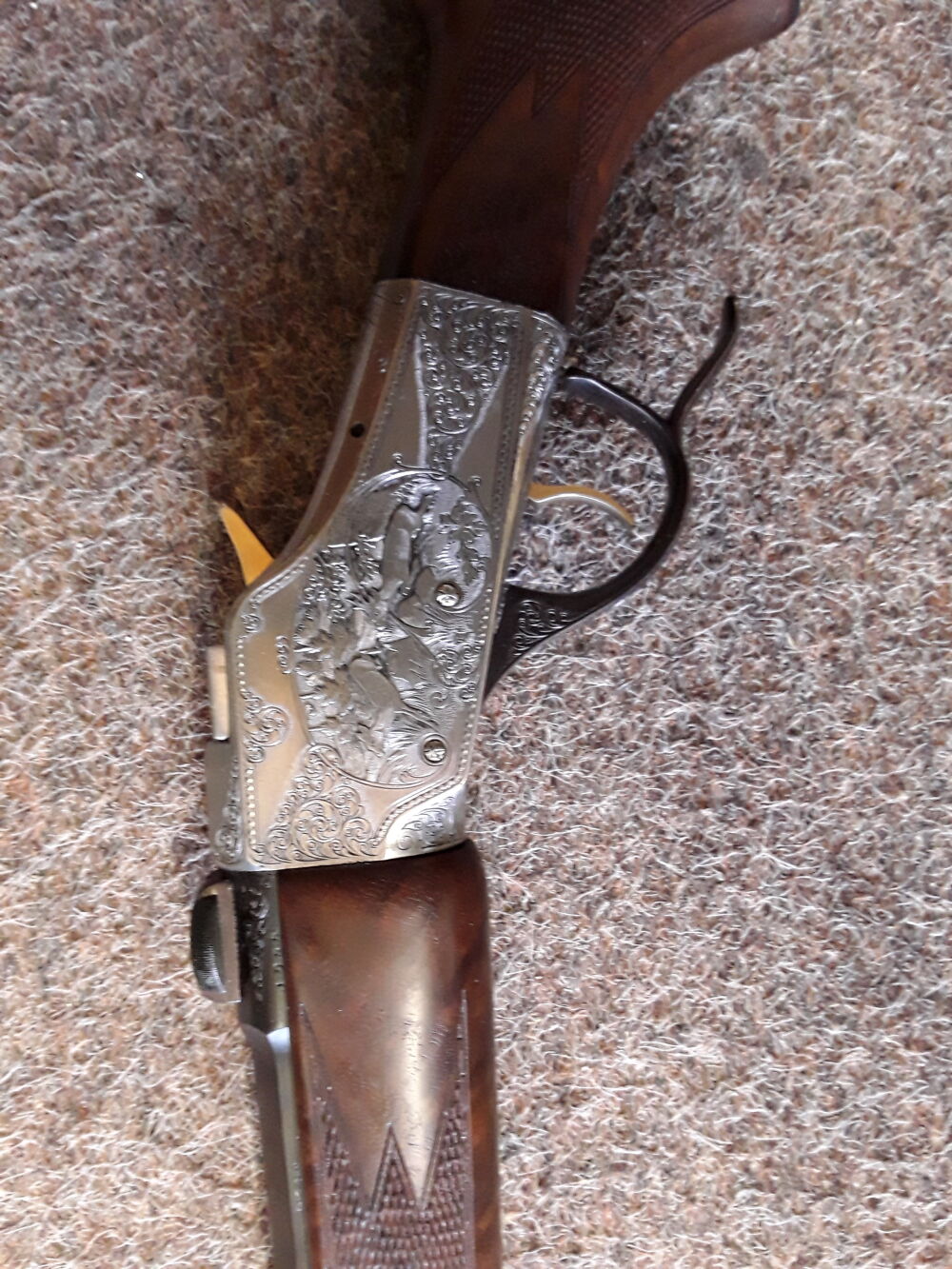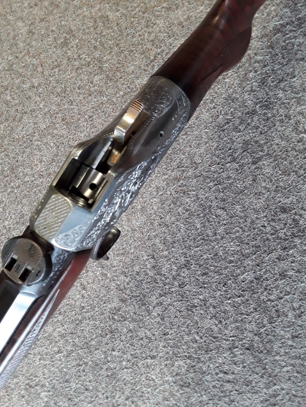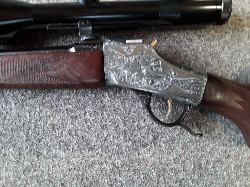 Neuwertige Fallblockbüchse mit Hahn.Achtkantlauf durchgehnd,aufwändige Gravuren,sehr gutes Nussbaumschaftholz.SEM Zeiss 6x42 neuwertig.