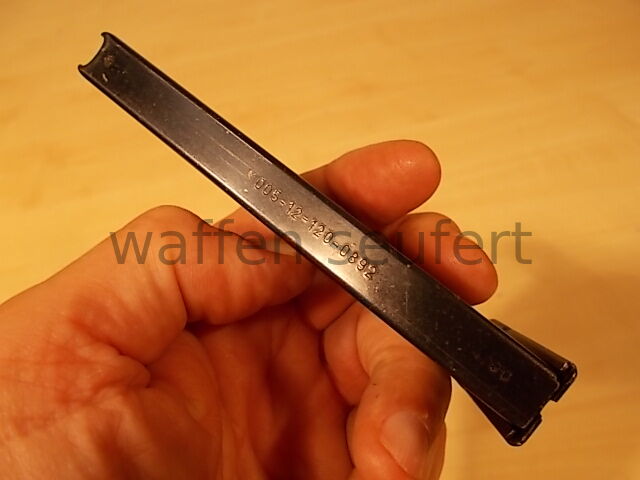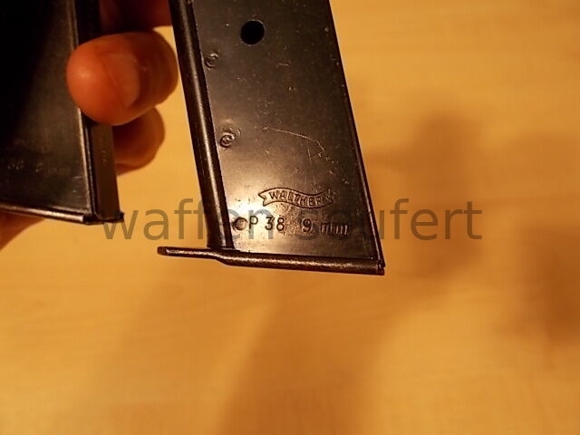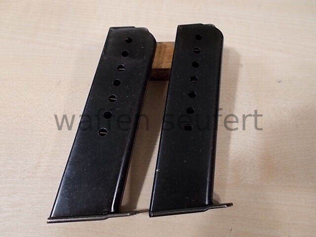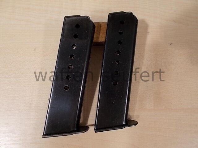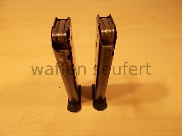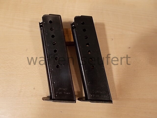 Walther P1 2er Set Ersatzmagazin original Bundeswehr verpackt Kaliber .9mmLuger. Einsteckmagazin für 8 Patronen frühe Fertigung 50er und 60er Jahre. Gestempelt: Seitlich Waltherschleife P1 9mm, Magazinrücken: BW Adler, Bundeswehr Inventarnr. mit Herstellungsjahr und Monat z.B: 1005-12-120-0892 8/59 + 4/59. Matt Schwarz, Originalverpackt/ Neuwertig