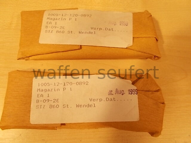Walther P1 2er Set Ersatzmagazin original Bundeswehr verpackt Kaliber .9mmLuger. Einsteckmagazin für 8 Patronen frühe Fertigung 50er und 60er Jahre. Gestempelt: Seitlich Waltherschleife P1 9mm, Magazi... ...weiterlesen