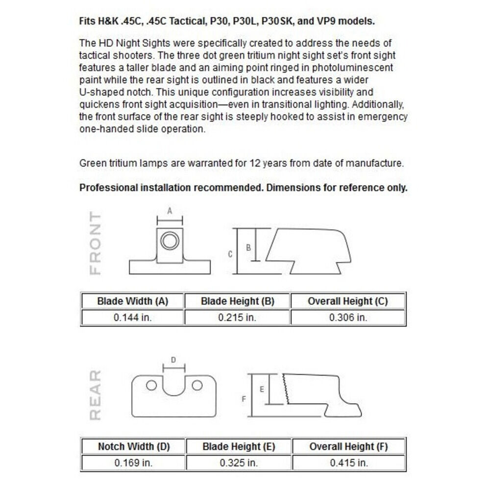 Heckler & Koch 45 Compact, Tactical, P30, P30L & VP9 Pistole, Night Visierset HD grün, Visierkorn gelb selbstleuchtend, Trijicon USA. Nacharbeiten sind eventuell erforderlich - eine fachgerechte Montage wird empfohlen!