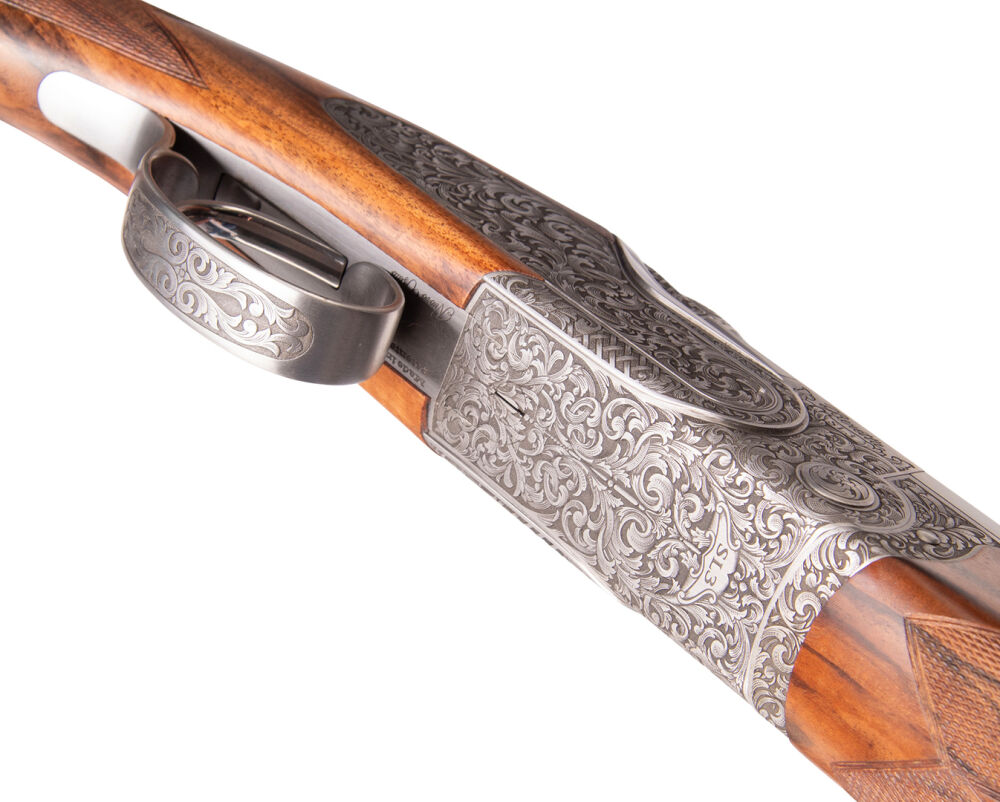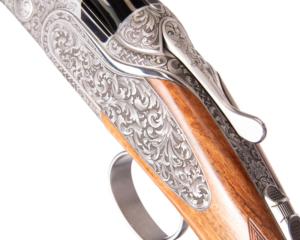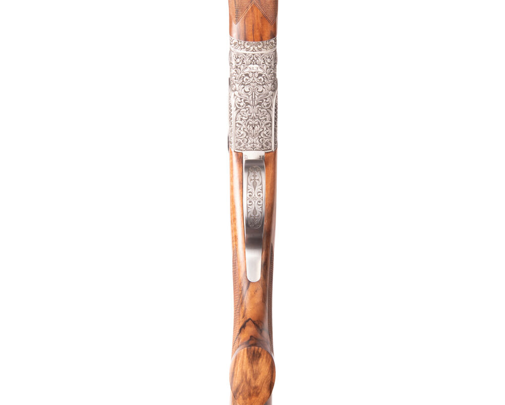 > Schlosskonstruktion mit tief liegenden V-Federn für ein präzises Abzugsverhalten (Seitenschloss-Charakter)