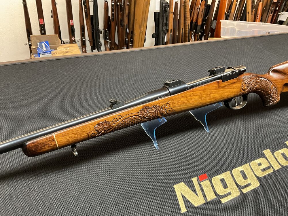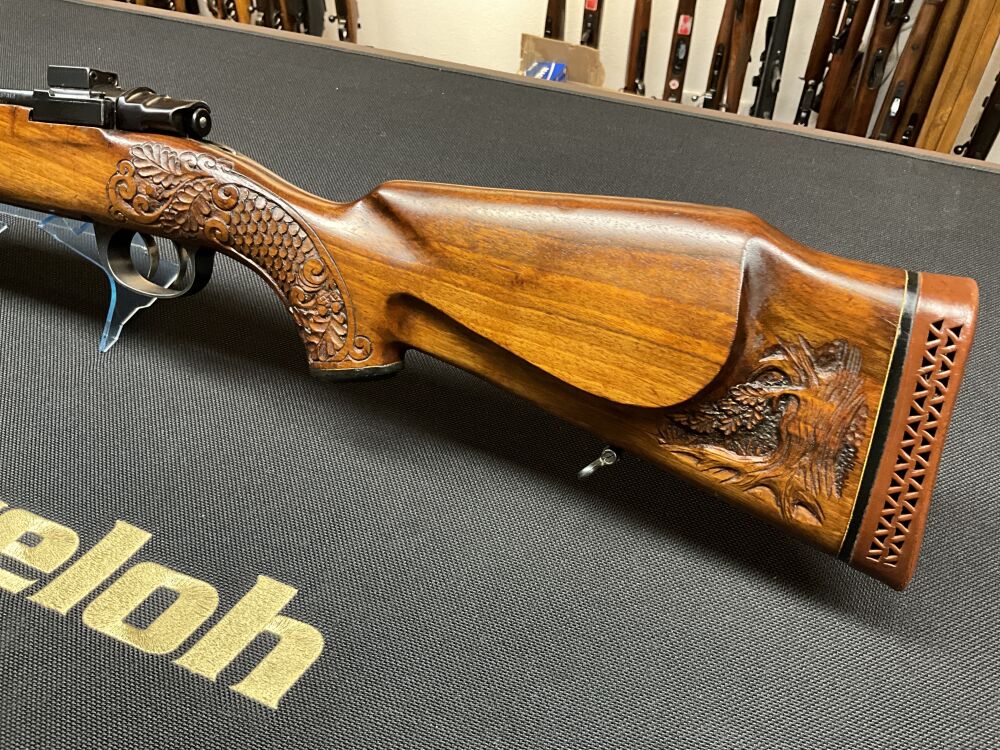 Eine Reppetierbüchse mit außergewöhnlicher Schaft Verschneidung. Die Waffe hat einen Deutschen Stecher und eine Seitliche Schiebe Sicherung. Eine bereits verbaute EAW Montage ermöglicht eine Zielfernrohr Montage.