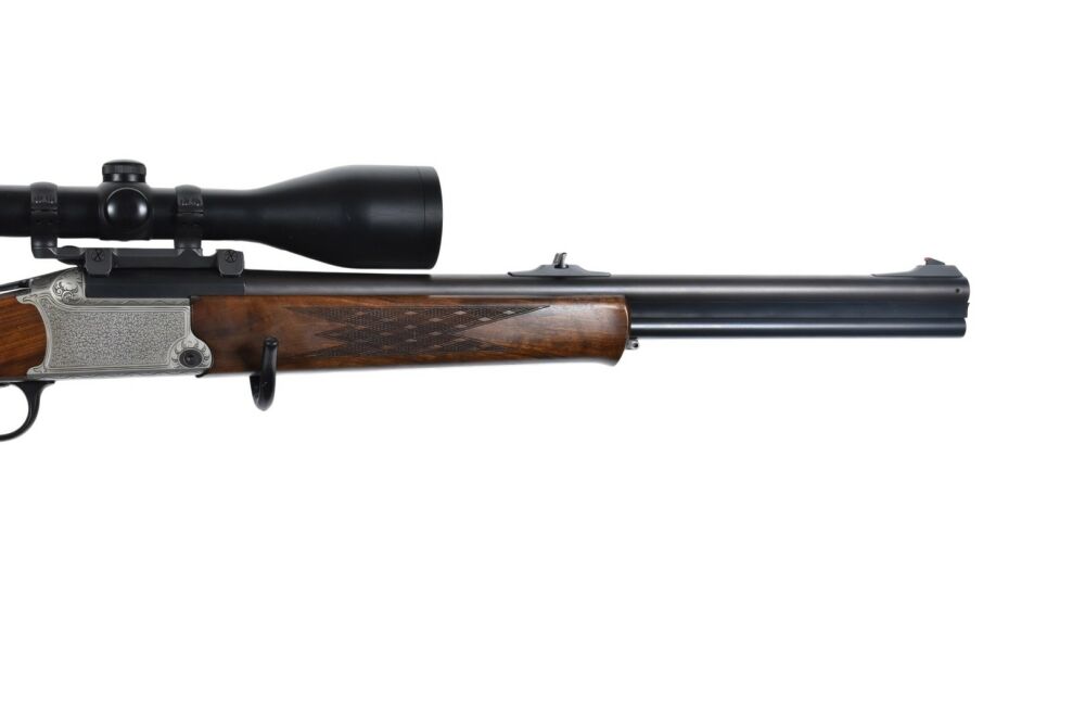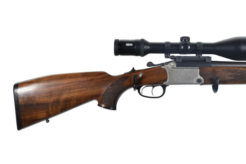 Diese Blaser 97 Bockdoppelflinte im Kaliber .30R Blaser / 20/76 mit zusätzlichem Austauschlauf im Kaliber 9,3x74R hat eine Gesamtlänge von 98 cm, eine Lauflänge von 56 cm und eine Schaftlänge von 36 c... ...weiterlesen