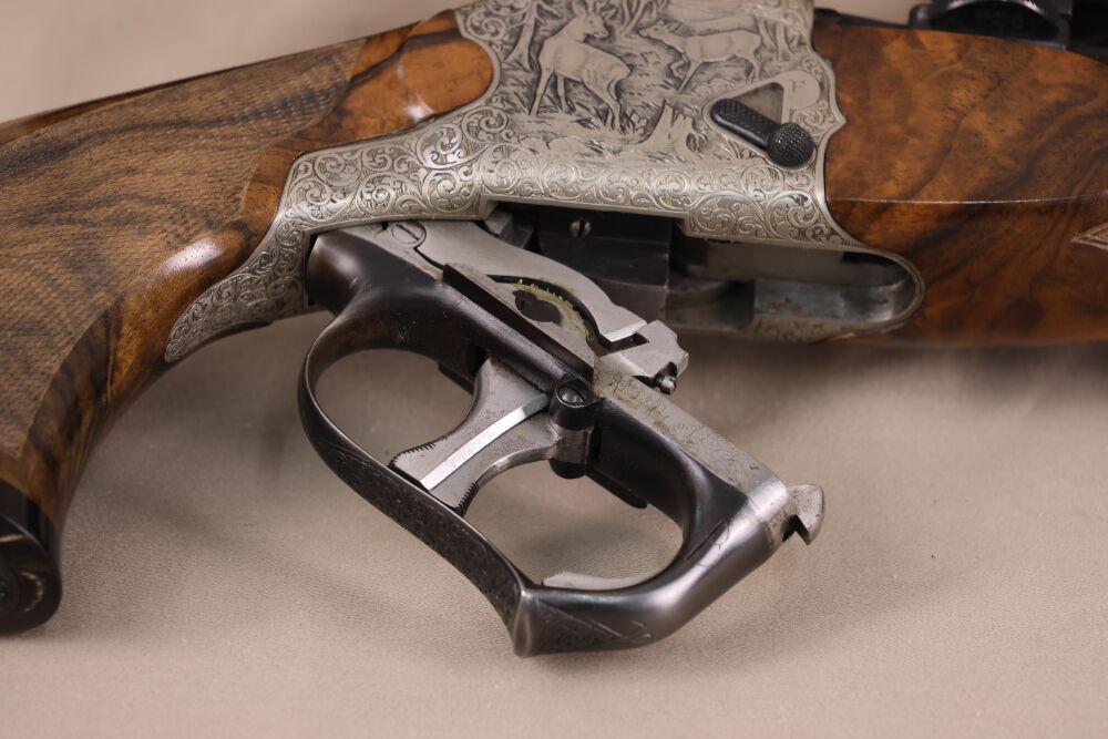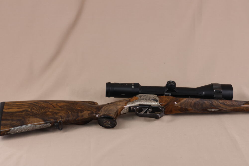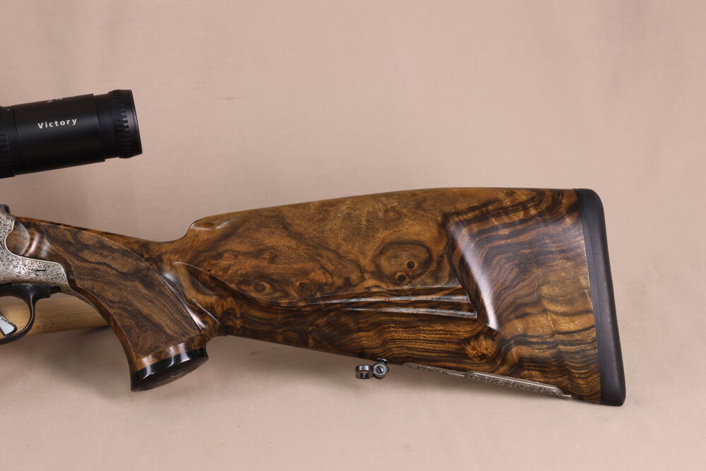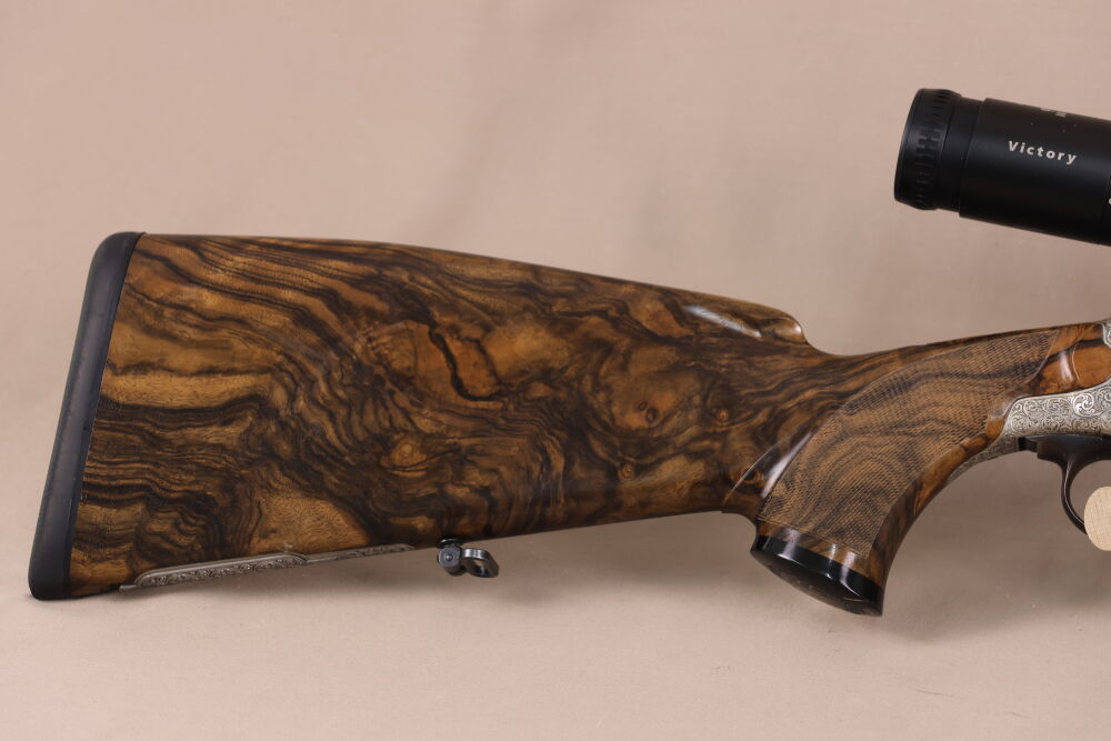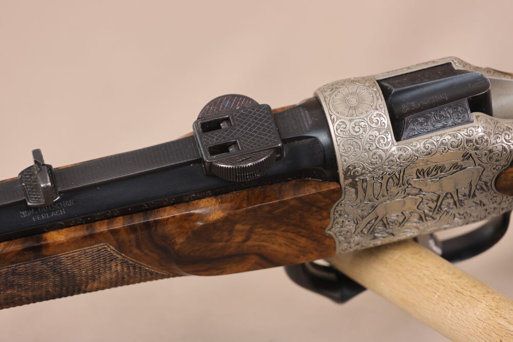 Die Waffe verfügt über ein wunderschönes Wurzelholz mit scharfer Fischhaut, Krawatte, formschönem Vorderschaftabschluss und bayerischer Doppelfalzbacke, einen Achtkantlauf mit offener Visierung, elegante Tierstückgravuren, einem Rückstecher und Schaftmagazin.
