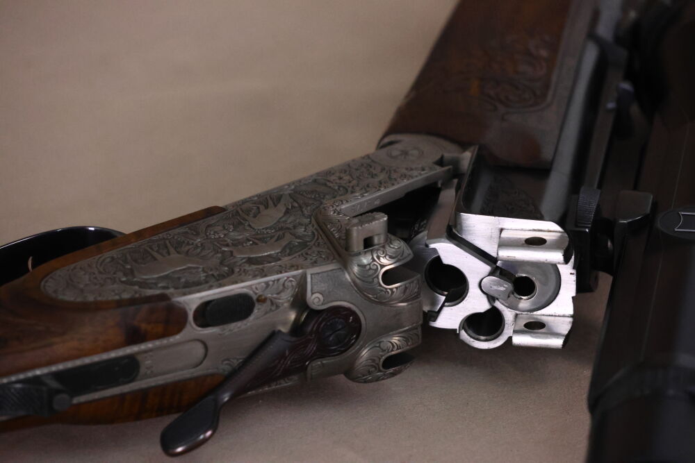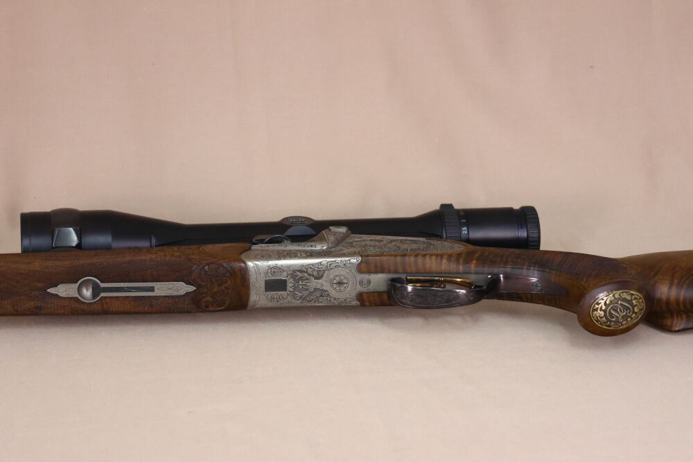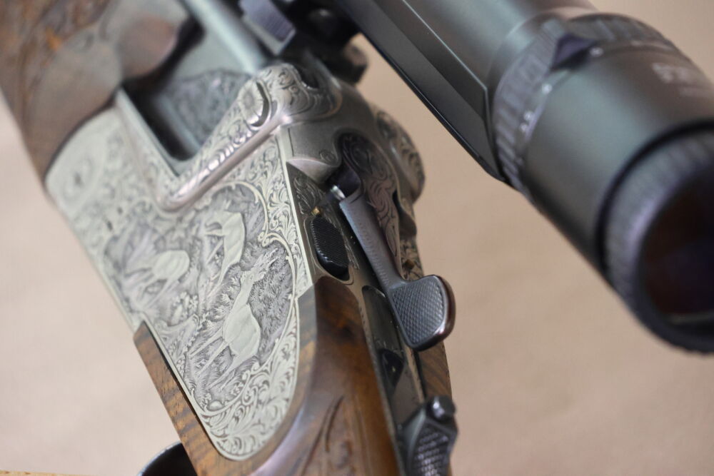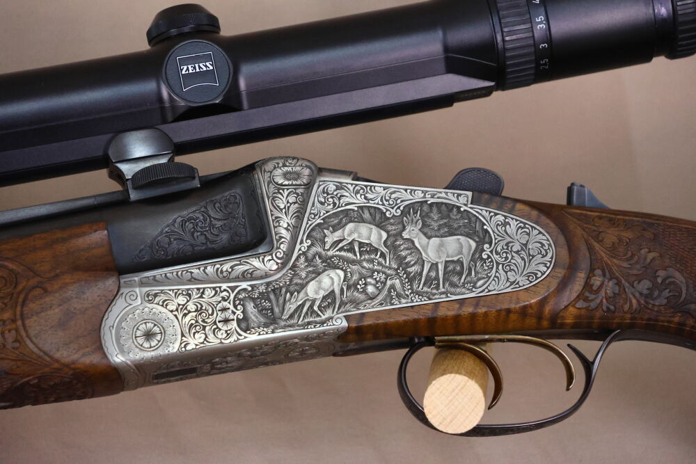 Neben den reichhaltigen Tierstückgravuren verfügt der Bockdrilling über eine separate Kugelspannung für die große Kugel, einen Rückstecher für den vorderen Abzug, Laufwurzelgravur, eine Fortner-Mündungsverstellung, einen Einstecklauf für den Schrotflauf (Kal. .22 Mag.), schönes Schaftholz (links-Schaft!) mit Bayerischer Doppelfalz-Backe, Stahlpistolengriffkäppchen sowie eine dezente Laub-Fischhautbegrenzung an Vorder- und Hinterschaft.